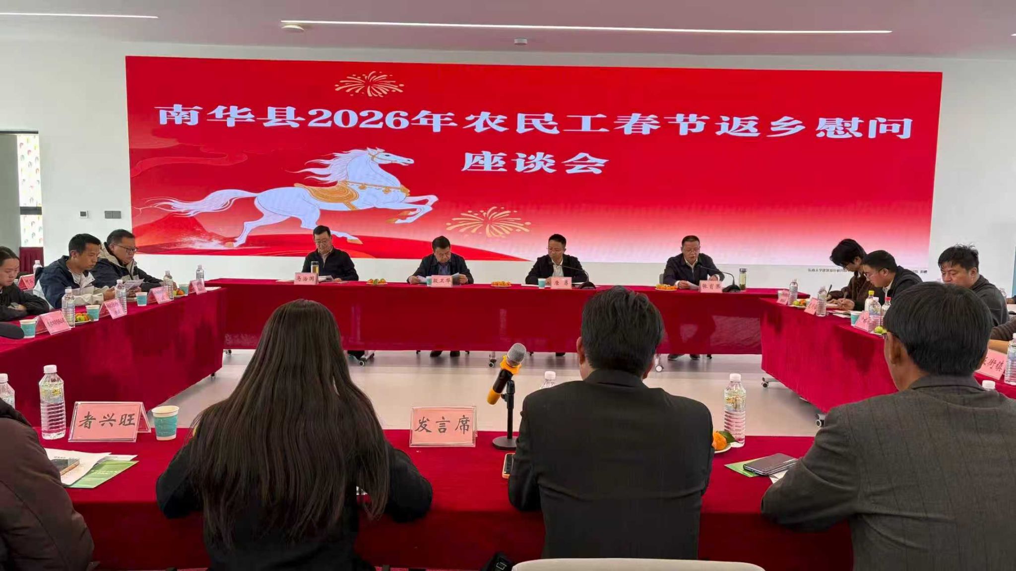 2026年2月12日下午,南华县野生菌交易中心至善非遗传习馆三楼会议室内暖意融融、乡情浓郁。2026年春节返乡人员慰问座谈会在此举行,外出务工代表、返乡创业先锋、致富带头人、劳务经纪人及企业负责人等80余人齐聚一堂,共叙乡情、共谋发展。这场别开生面的“新春第一会”,以实地观摩与深度对话相结合的形式,全景展现南华跨越发展的强劲脉动,诚邀在外游子归巢筑梦。