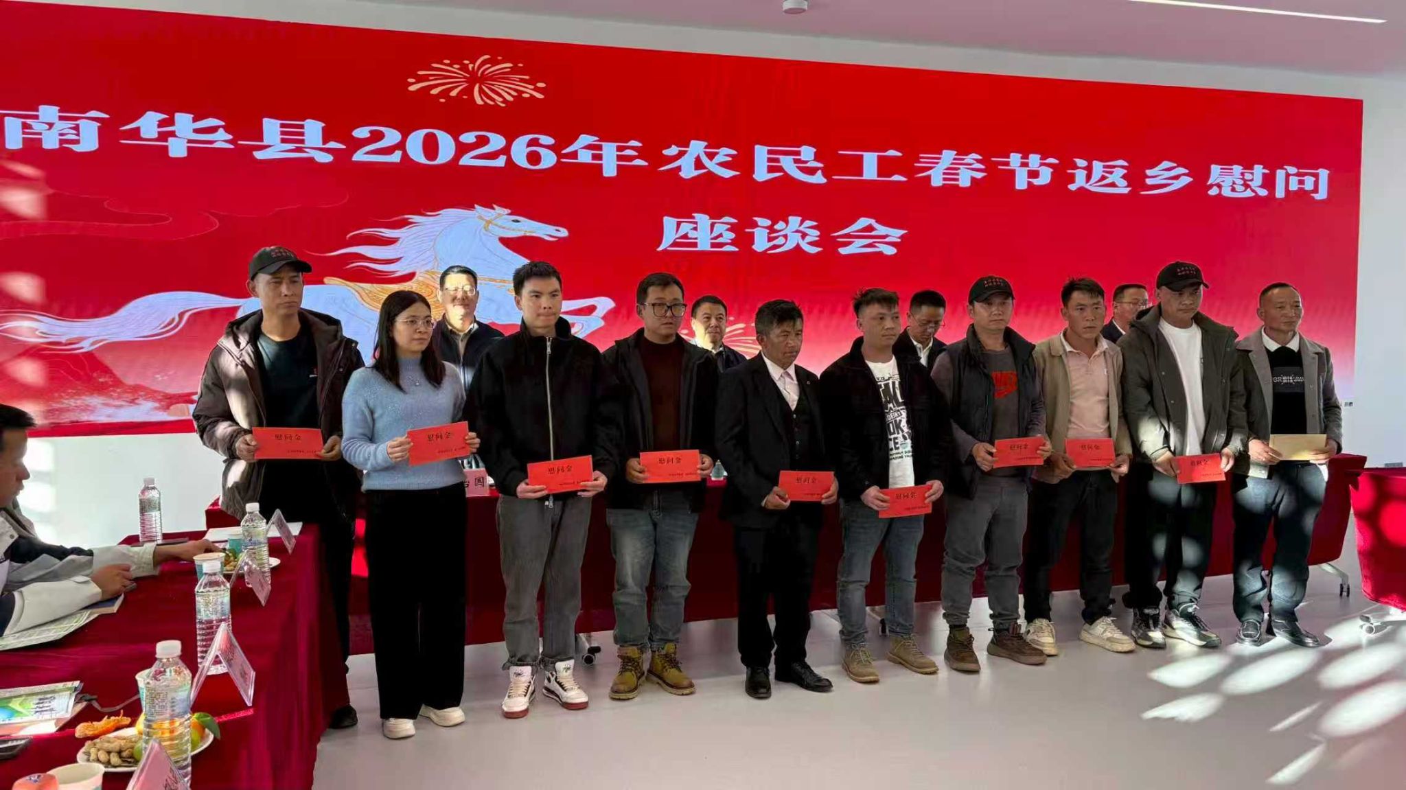 会议尾声,与会领导为家庭困难外出务工返乡代表发放慰问金,传递党委政府的牵挂与关怀。会议号召广大南华儿女争当和谐稳定的“守护者”、就业增收的“实干家”、返乡致富的“领头雁”,把浓浓乡愁化作建设家乡的强大动能。