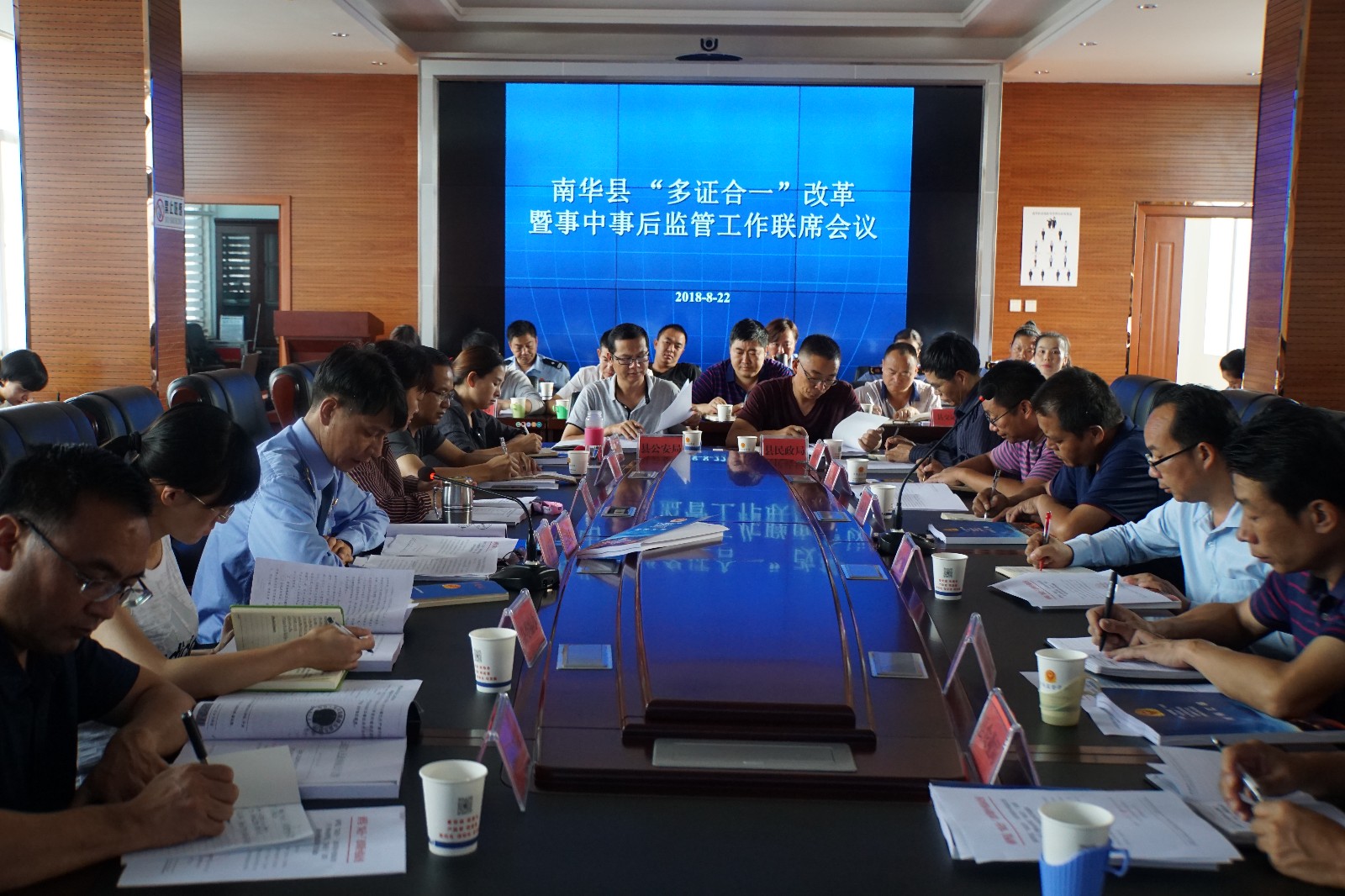 8月22日上午,南华县“多证合一”改革领导小组成员单位暨事中事后监管联席会议在县市场监督管理局召开。领导小组成员单位的分管领导、业务人员及市场监管局相关股室人员共47人参加会议。