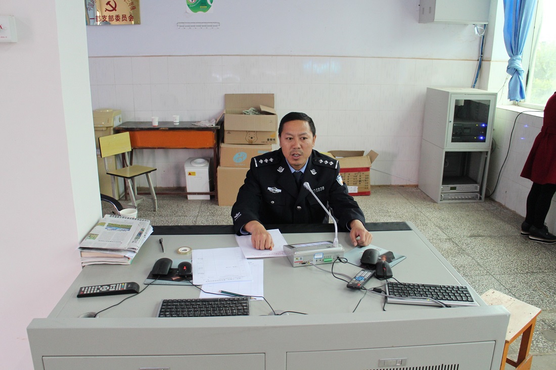 图为:南华县公安局交警大队李江警官在给师生上交通法制课