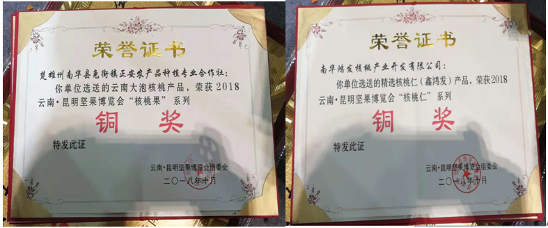 在坚果博览会产品评选中,南华鸿发核桃产业开发有限公司选送的核桃仁、兔街镇正安农产品种植专业合作社选送的大泡核桃,分别荣获2018云南·昆明坚果博览会“核桃仁”系列、“核桃果”系列铜奖!
