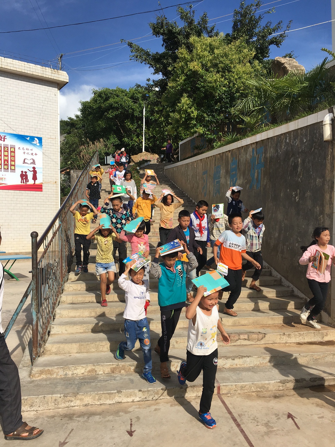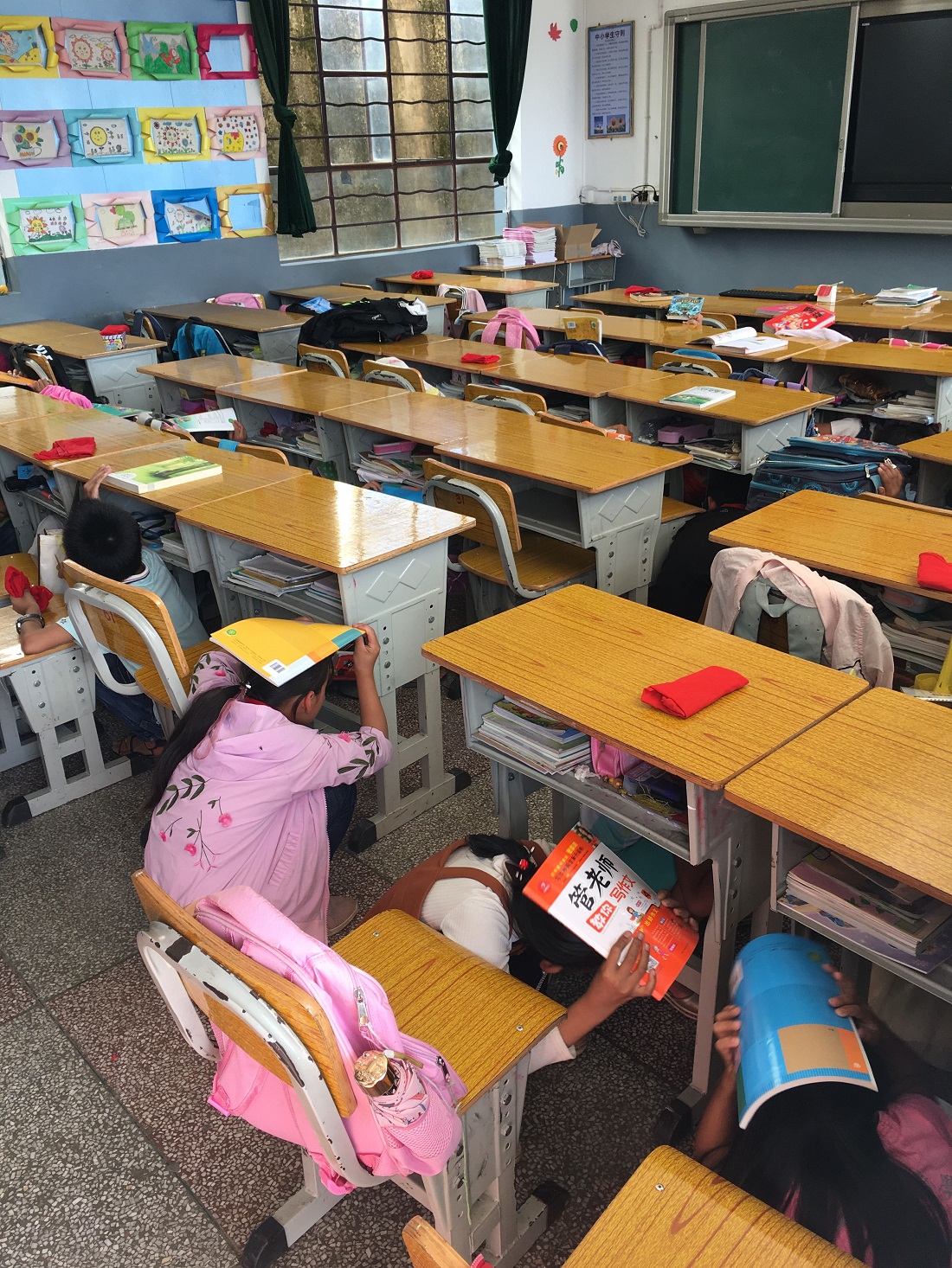 3、地震演练的学生用书本保护头部,迅速撤离。