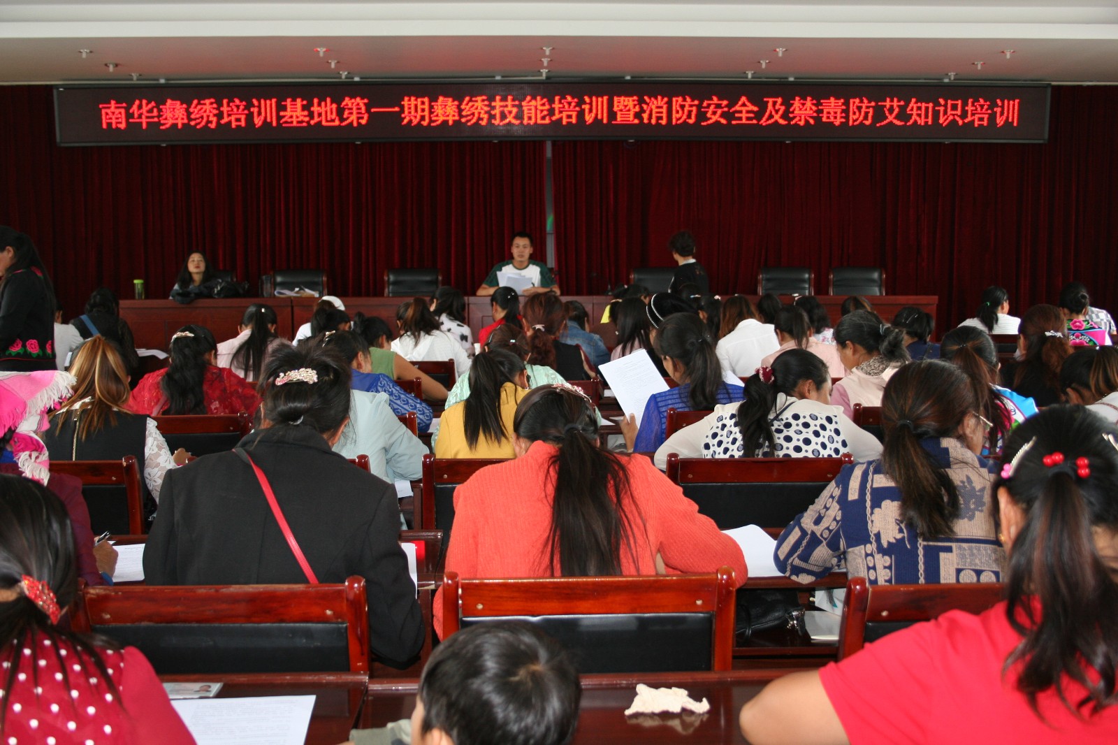 本期培训班共组织全县各乡镇110名妇女同志参加,参训人员分别来自南华县兔街镇、马街镇、红土坡镇、罗武庄乡、一街乡、沙桥镇、龙川镇等7个乡镇,年龄最小的19岁,最大的65岁,建档立卡贫困劳动力17人。此次培训时间为5天,本期培训由楚雄技师学院3名具有多年刺绣经验的资深讲解老师授课,培训以强化实际操作为主,理论知识并重的方式进行,重点讲解民族刺绣基础、刺绣图案花色设计创作、刺绣技能技法及民族刺绣产品市场营销与销售等内容。培训期间,南华县人社局还结合消防安全、禁毒防艾知识对参训人员进行为期半天的讲解,让参训同志做好宣传防范。