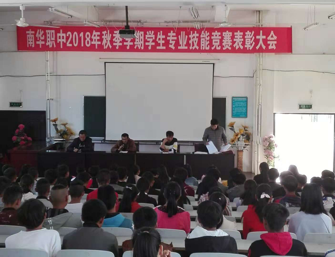 南华县职业高级中学学生技能大赛经过两轮激烈角逐,于2018年11月15日圆满结束。全体师生参加了颁奖仪式,校领导为获奖选手颁发了证书及奖品,校长刘忠富在会上讲话,对全校师生提出希望和要求。