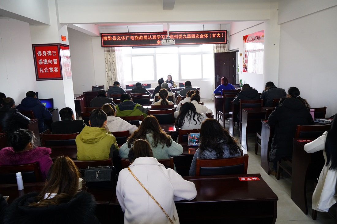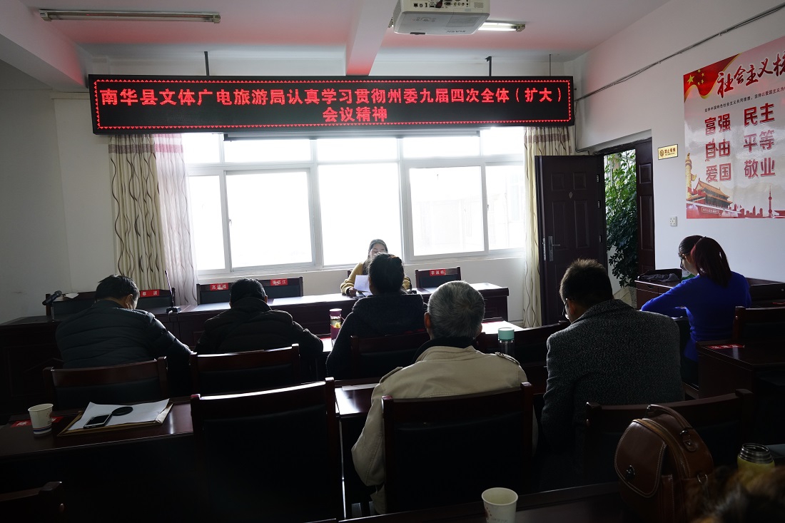 1月28日上午,南华县文体广电旅游局召开全体干部职工会议,认真传达学习了州委九届四次全体(扩大)会议精神。