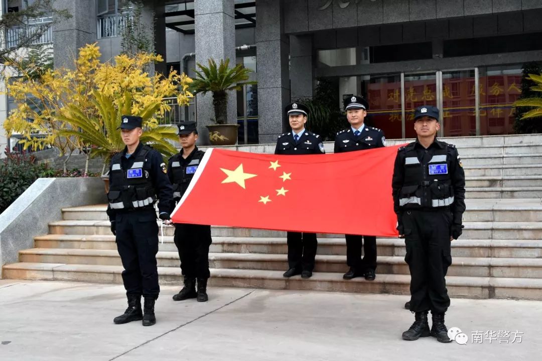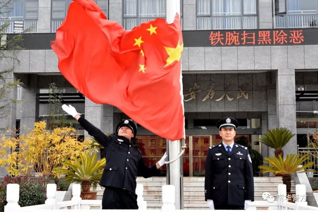 2019年1月1日上午9时,南华县公安局举行了庆元旦升国旗仪式,向伟大祖国祝福,表达忠诚爱国情怀。局党委班子成员,局机关、交警大队、特警大队、龙川派出所在家的全体民(辅)警100余人一同参加升旗仪式。