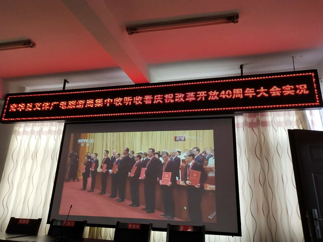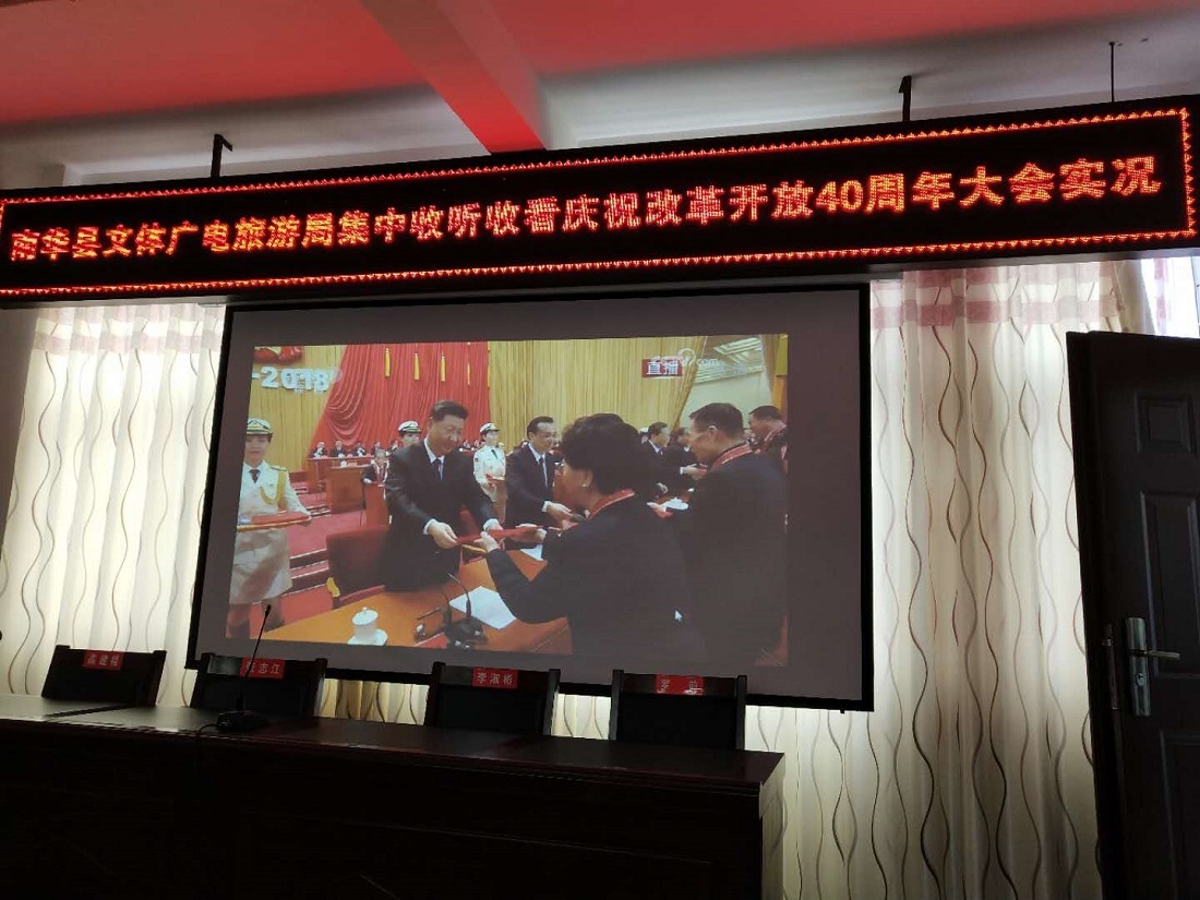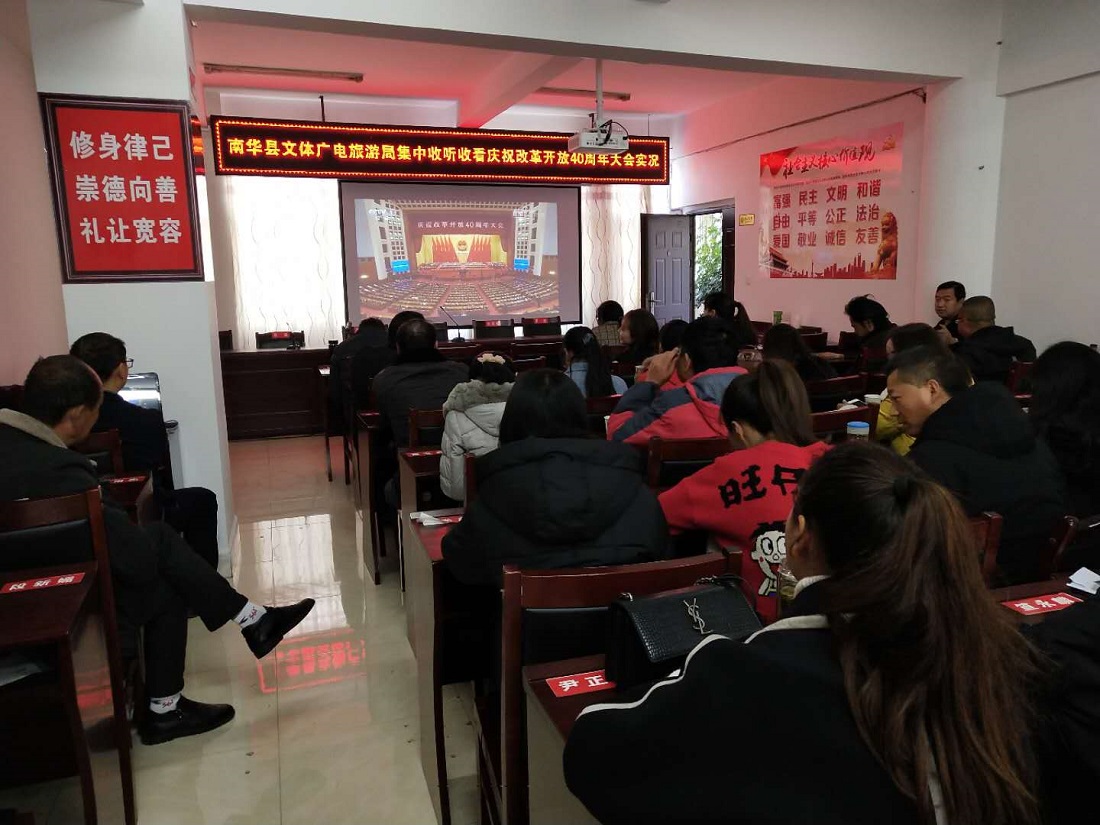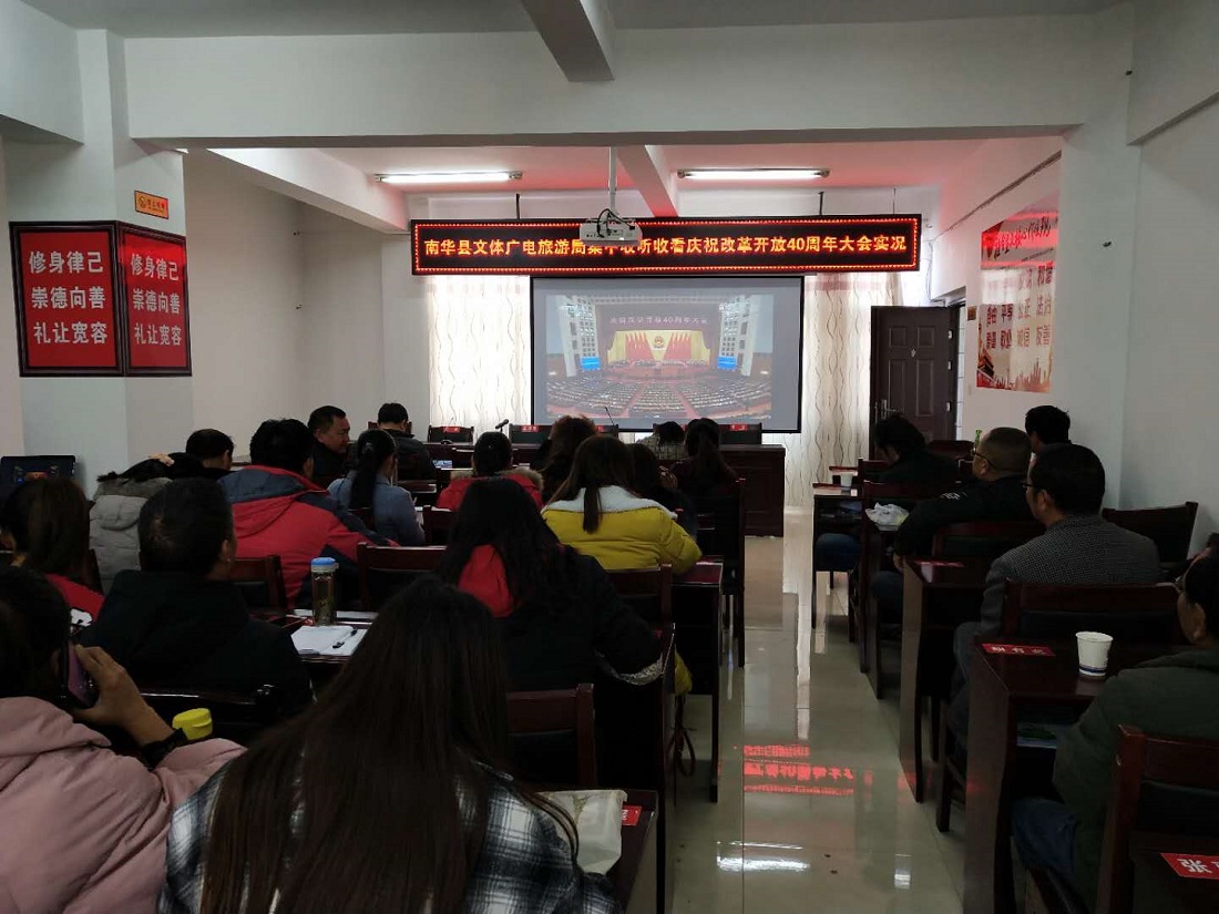 12月18日上午10时,庆祝中国改革开放40周年大会在人民大会堂隆重举行。南华县文体广电旅游局组织全体干部职工集中认真收听收看大会实况直播。