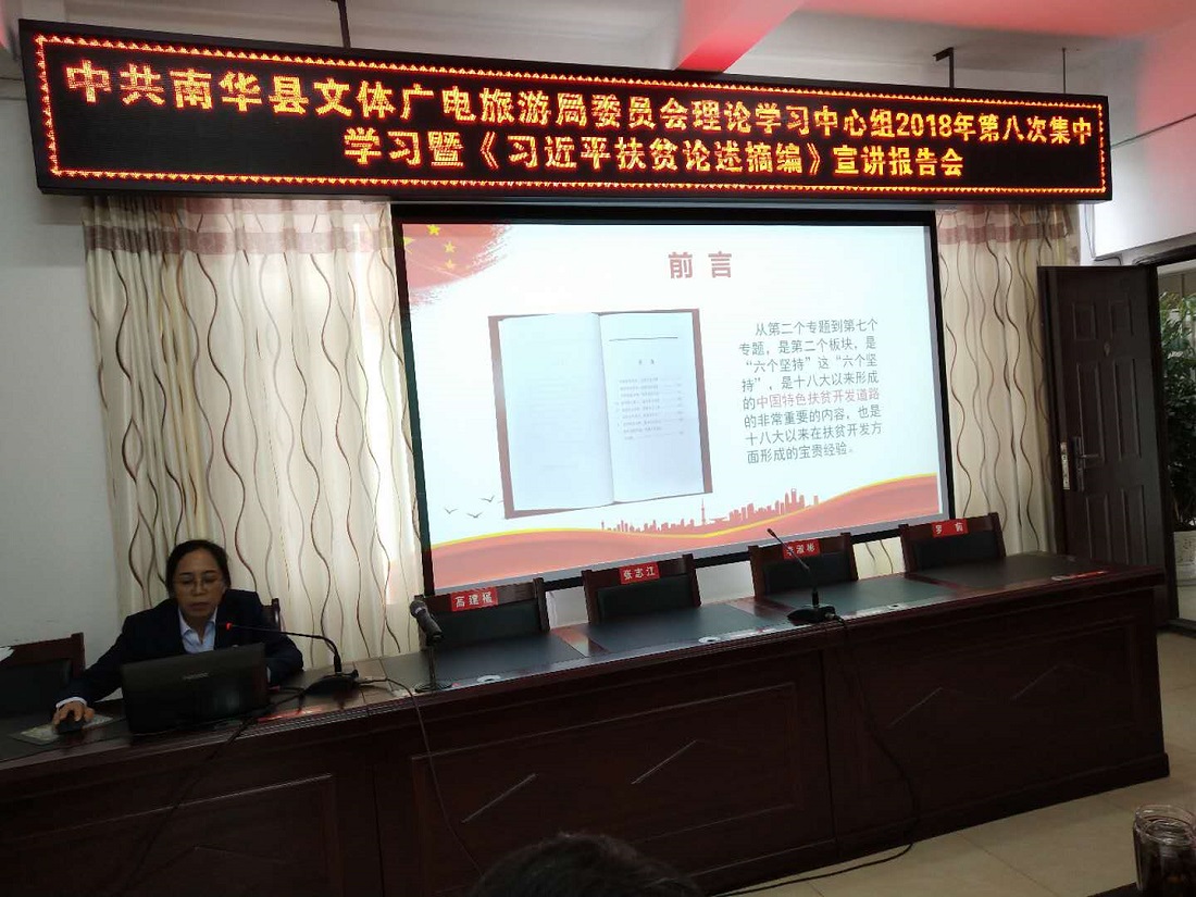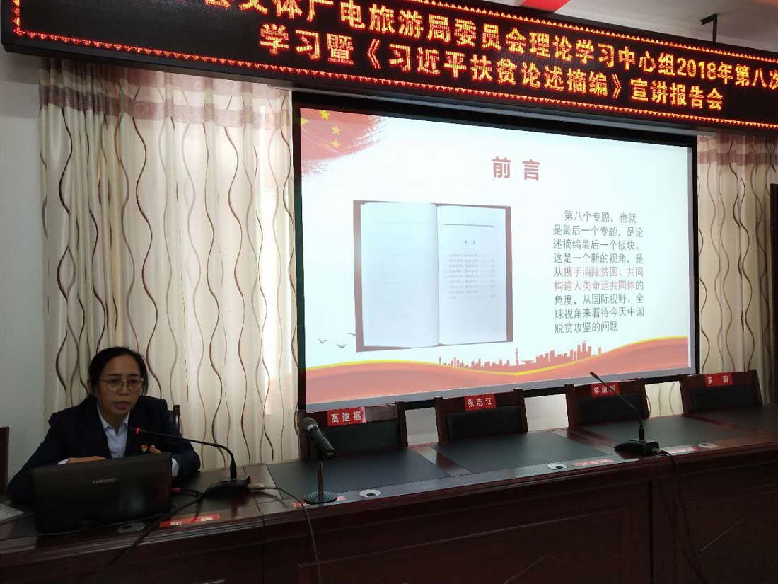 12月17日上午,县委宣讲团走进县文体广电旅游局宣讲《习近平扶贫论述摘编》,局领导班子成员、局属全体党员、全体干部职工共计100余人参加了宣讲报告会。