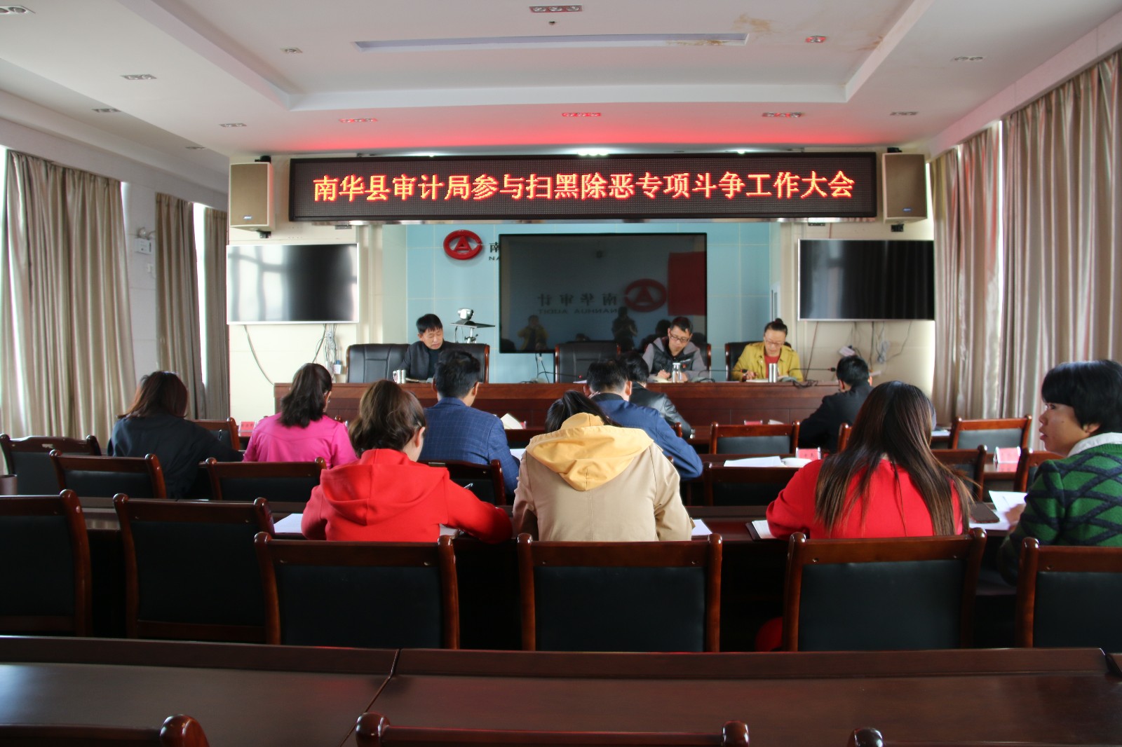 为坚决打赢扫黑除恶专项斗争攻坚战,审计局党组认真研究部署,迅速把思想认识统一到习近平总书记重要指示精神上来,打一场扫黑除恶的人民战争。成立了由局长任组长、班子成员为副组长、股长(主任)为成员的专项斗争领导小组,制定了《实施方案》、《工作规则》层层压实责任,共同维护稳定。在开展扫黑除恶专项斗争中,持续推进法治教育、党纪党规警示教育等专项教育,认真履职尽责,要切实发挥审计部门全面从严治党的“尖兵”作用、强化干部监督的“利剑”作用和经济社会发展的“参谋”作用,为全县扫黑除恶专项斗争取得压倒性胜利贡献力量。各股室、县政府投资审计中心务必密切配合、迅速行动,在坚决执行中央和省委、县委工作部署的基础上,狠抓关键措施落实,扎实开展严打及重点整治工作,始终保持对黑恶势力犯罪的高压震慑态势。