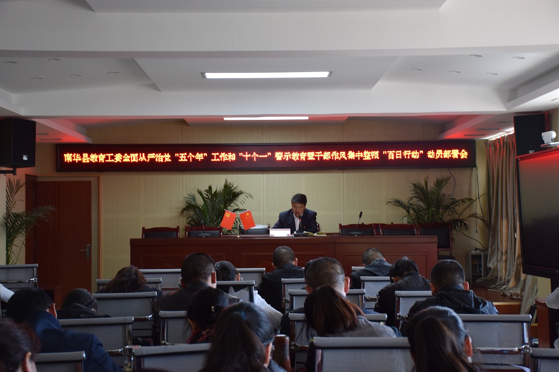 3月29日,南华县教育体育局启动集中整顿干部工作作风“百日行动”,彻底整治工作作风、工作纪律、工作态度、工作落实方面的不良现象,行动将持续到6月底。动员会议上,首先传达学习了全县全面从严治党“五个年”工作和“十个一”警示教育推动会暨干部作风集中整顿“百日行动”部署会议精神,学习了县委李书记在动员会上的讲话精神。要求教育体育系统全体干部教师要统一思想认识,提高政治站位;突出问题导向,全面深挖细查;抓好统筹结合,对标对表落实;强化督促检查,确保取得实效;扎实开展“干在实处,走在前列”大比拼,为奋力推进南华教育体育事业优质均衡内涵发展提供坚强保障。(南华县教育体育局 吕慧芝)