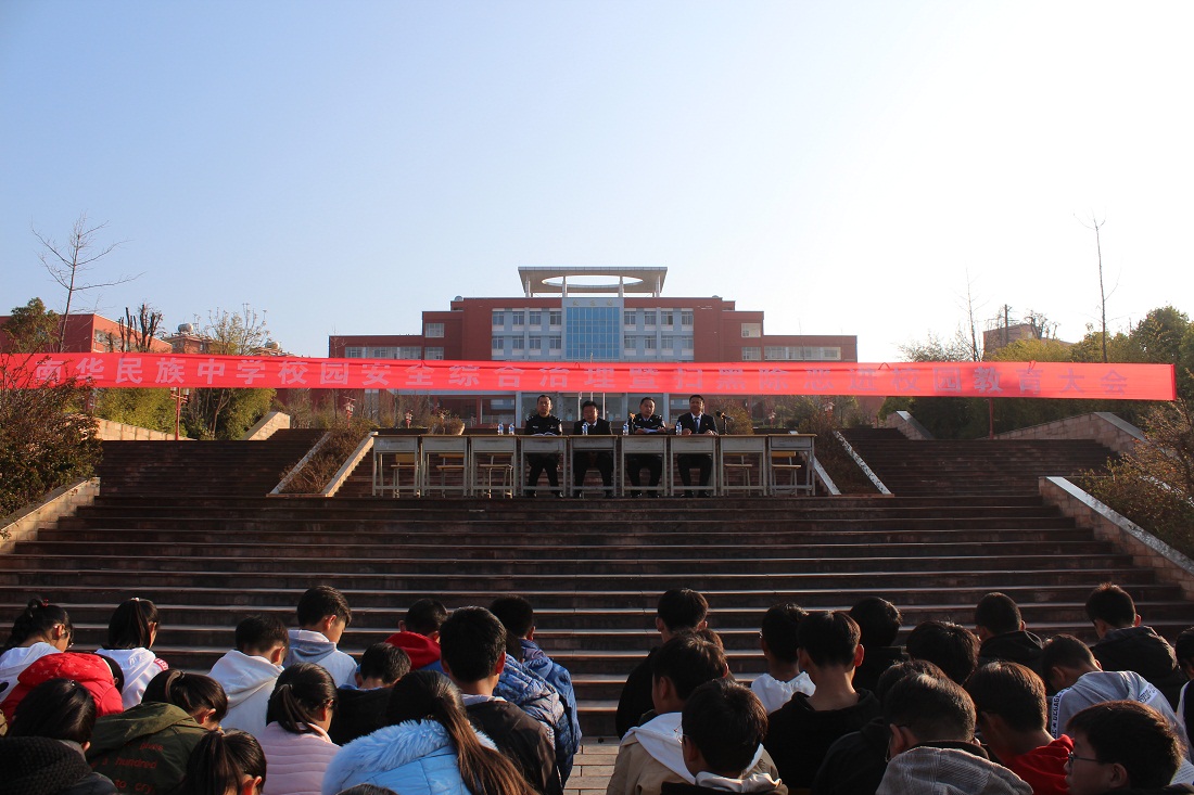 为加强学校安全管理,增强学生安全防范意识,建设平安和谐校园,3月9日上午,南华民族中学开展了“校园安全综合治理暨扫黑除恶进校园”主题教育活动,活动邀请南华县交警大队副大队长夏勇、王华,龙川派出所民警戴必旺到会做宣讲和指导,全体师生参与。