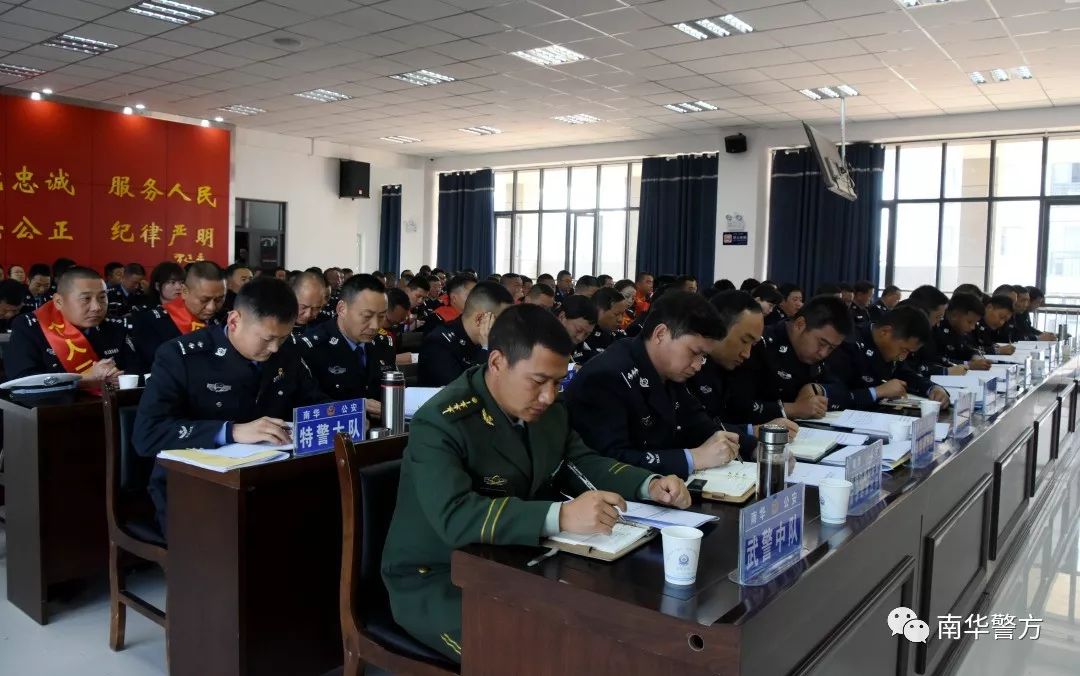 会议强调,全县公安机关要始终坚持以习近平新时代中国特色社会主义思想为指导,牢牢把握“对党忠诚、服务人民、执法公正、纪律严明”总要求,毫不动摇地坚持和加强党对公安工作的绝对领导、全面领导,树牢“四个意识”、坚定“四个自信”、坚决做到“两个维护”,全面贯彻总体国家安全观和以人民为中心的发展思想,坚持稳中求进工作总基调,聚焦政治建警、聚焦主责主业、聚焦风险防控、聚焦基层基础、聚焦改革创新,学精神、控风险、守底线、补短板、严纪律,以涉险滩、挑重担、打硬仗的担当精神,紧紧围绕扫黑除恶、大庆安保“两大首要任务”,持之以恒打造“一支铁军”,打赢政治安全、风险化解、严打犯罪、公共安全、社会防控“五大主动仗”,锻造社区警务、法治公安“两大亮点”的“2152”工作思路,主动融入和服务“1133”战略,以高质量平安服务保障高质量发展,实现主业更强、机制更优、基础更牢、队伍更精、社会更稳,人民群众获得感幸福感安全感更加充实、更有保障、更可持续,奋力开创新时代南华公安工作新局面,以优异的成绩向新中国成立70周年献礼。