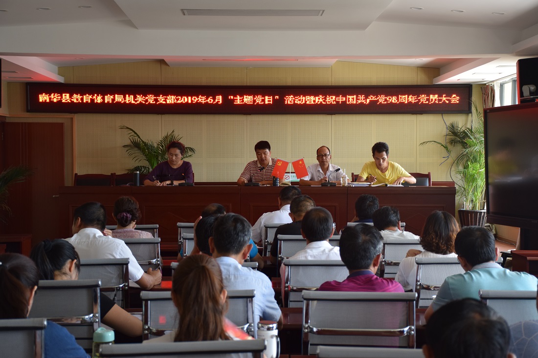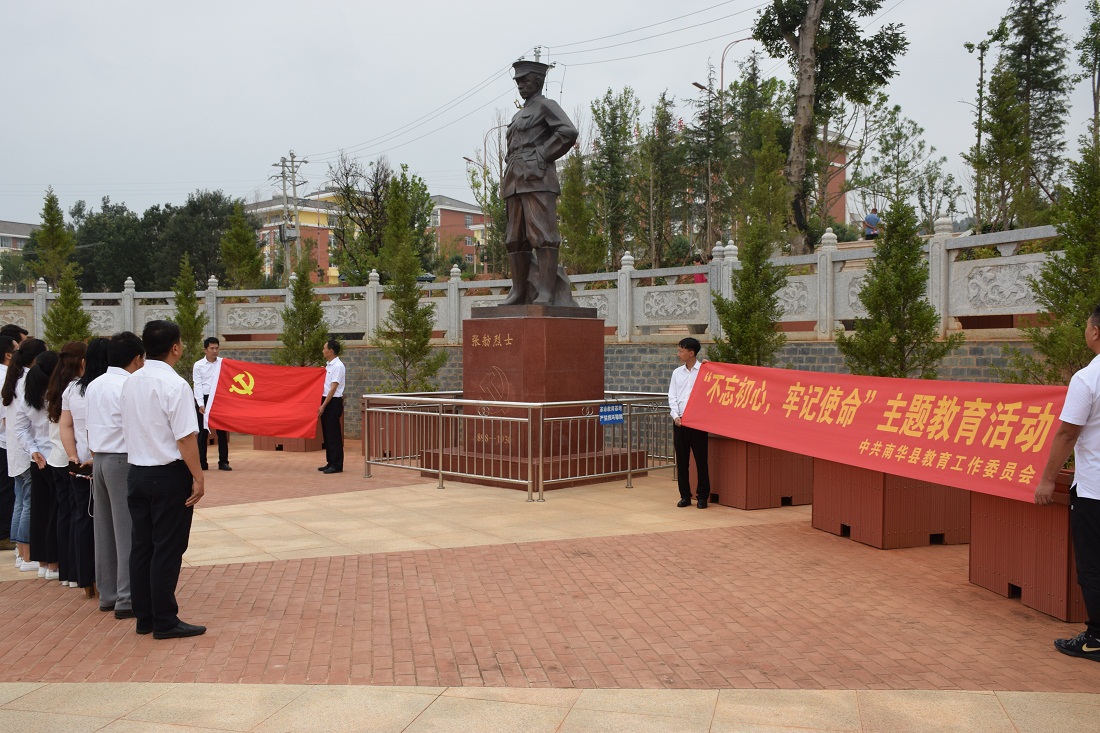 为隆重庆祝中国共产党成立98周年,重温党的光辉历史,讴歌党的丰功伟绩,继承和发扬党的优良传统,切实增强“四个意识”,激发广大党员教师立足岗位作贡献,在决胜脱贫攻坚、同步全面小康中充分发挥先锋模范作用,南华县教育工委在建党节期间扎实开展“十个一”活动,即开展一次以“不忘初心、牢记使命”为主题的主题党日活动、讲授一次专题党课、到县城湿地公园张舫烈士铜像广场前缅怀先烈开展一次党史党性教育、开展一次驻村队员遍访、到联系户家中开展一次驻村帮扶工作、开展一次遍访贫困家庭学生活动、走访慰问一次老党员和困难党员、表扬一批先进党组织和优秀党组织书记、命名一批规范化建设党支部、教师暑假期间举办一期“万名党员进党校”示范培训班,向党的98岁华诞和新中国成立70周年献礼。