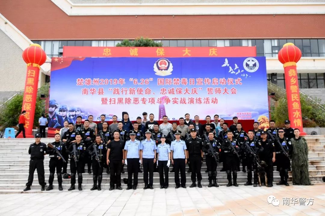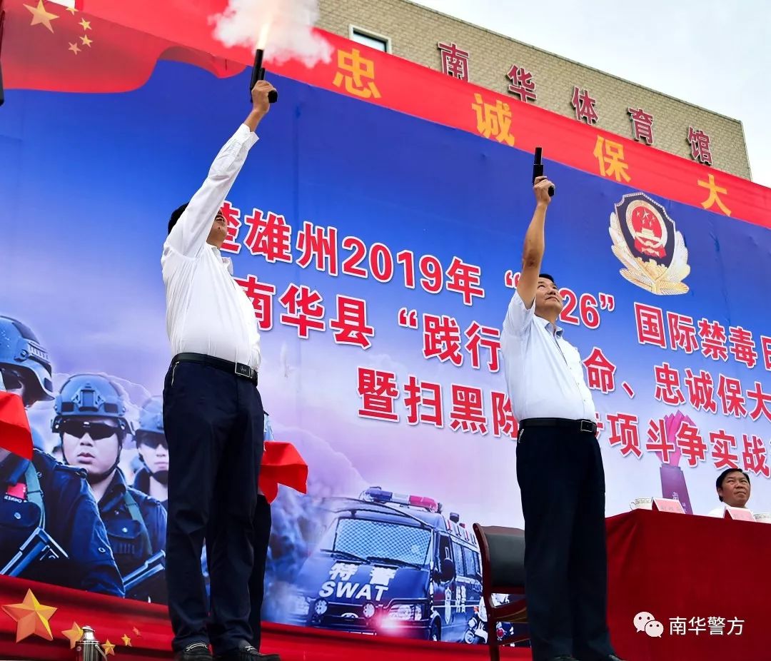 为认真学习贯彻习近平总书记在全国公安工作会议上的重要讲话精神,扎实推进扫黑除恶专项斗争和禁毒人民战争,向黑恶势力亮剑、向毒品犯罪宣战,向全社会表明州委、州人民政府、县委、县人民政府扫黑除恶、禁毒扫毒的坚定立场和决心。6月26日上午,楚雄州2019年“6.26”国际禁毒日宣传启动仪式和南华县“践行新使命、忠诚保大庆”誓师大会暨扫黑除恶专项斗争实战演练活动在南华举行。