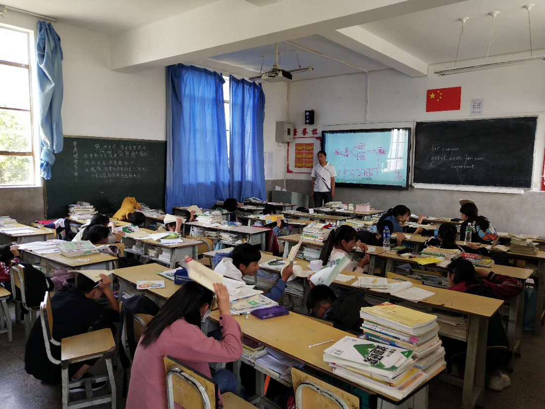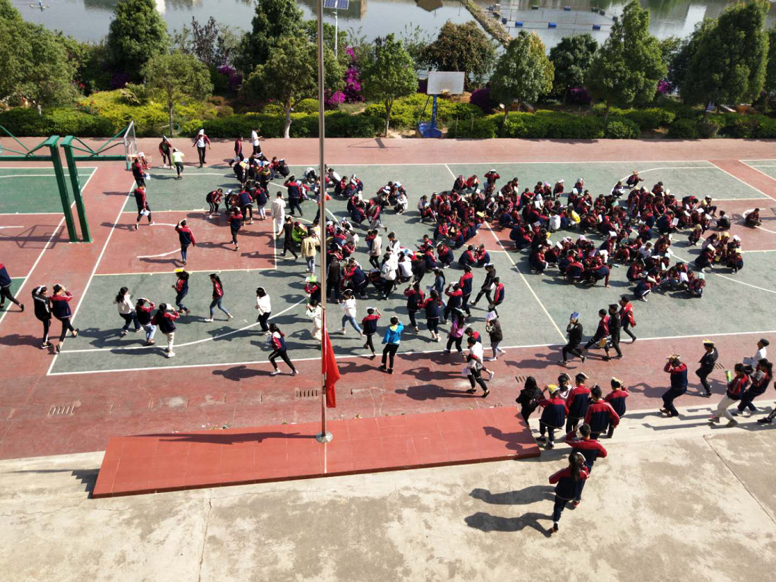 上午10点整,全校师生正在上第二节课,一阵急促的警报声突然在校园上空响起,听到熟悉的警报声,学生们熟练地立即蹲到课桌下,抱手护着头。第二次警报声响起,在老师的指挥下迅速撤离教室。走廊上、楼梯间、安全通道旁老师们指挥学生有序疏散到开阔的运动场上。在计划时间内学生全部到达运动场,各班清点人数并上报给政教主任。整个演练过程紧张有序、有条不紊,各年级各班学生均能做到安全疏散、快速集合,没有发生任何互相推挤或踩踏事件。