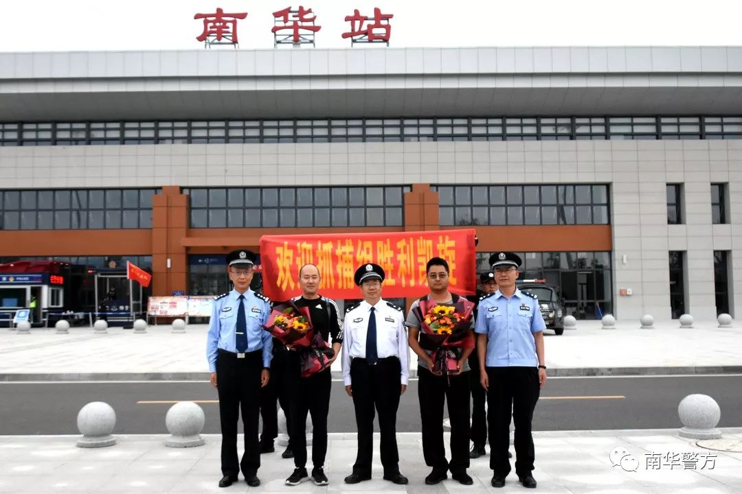 9月24日下午,经过70余小时长途押解,南华县公安局“云剑”追逃抓捕组民警从广州押解着1名盗窃犯罪嫌疑人胜利归来。州公安局党委委员、驻局纪检监察组组长柳思平,县人民政府副县长、县公安局党委书记、局长张惊雷,州公安局信访处处长冯杰,县局党委委员、副局长包文华前往南华高铁站迎接,欢迎胜利归来的抓捕组民警,并给抓捕组民警送上鲜花。柳思平组长对抓捕组民警表示亲切的慰问。张惊雷副县长对抓捕组民警辗转千里、克服困难、连续作战、顽强拼搏的优良作风给予充分肯定,希望抓捕组民警在下一步工作中不忘初心、坚定信心、再立新功。