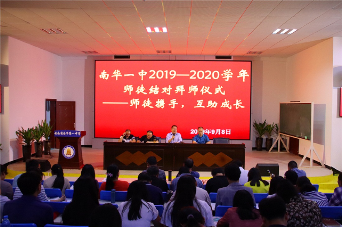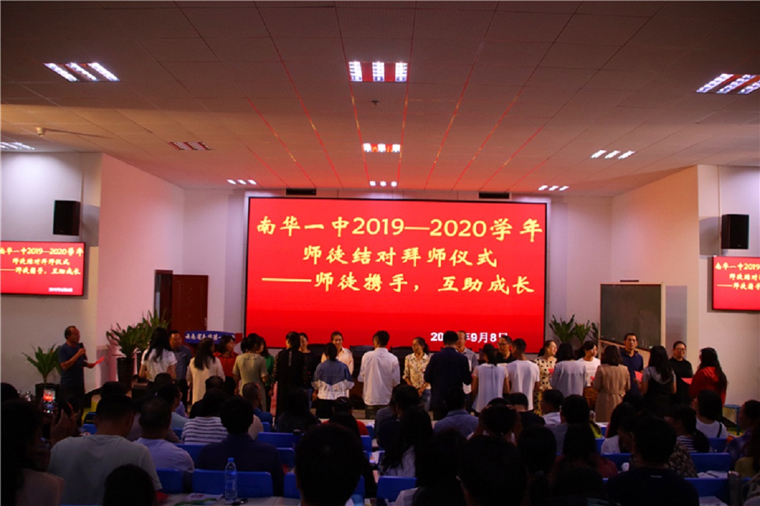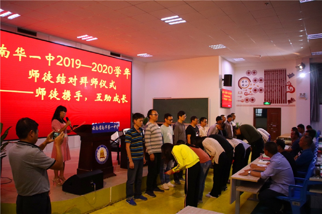 为充分发挥我校教学骨干、教研组长和经验丰富的教师教育教学优势及示范、引领作用,依托县高中名师工作室各学科工作规划,通过传、帮、带,互研与合作来促使青年教师与骨干教师的专业提高,实现“双赢”进而提高教师队伍整体素质,我校于2019年9月8日晚,在多媒体报告厅举行了南华一中举行了第二届“师徒结对”拜师仪式。学校共有36位青年教师与学校优秀骨干教师进行师徒结对,大会由教学中心周雄主持。