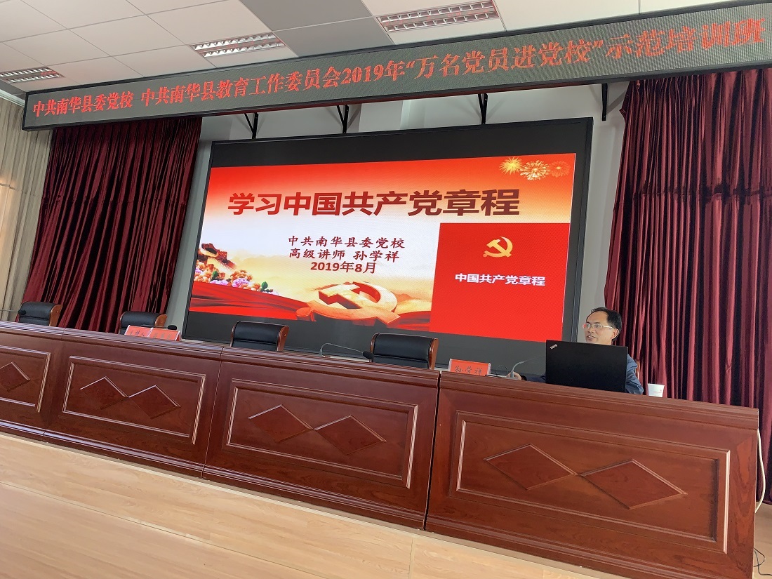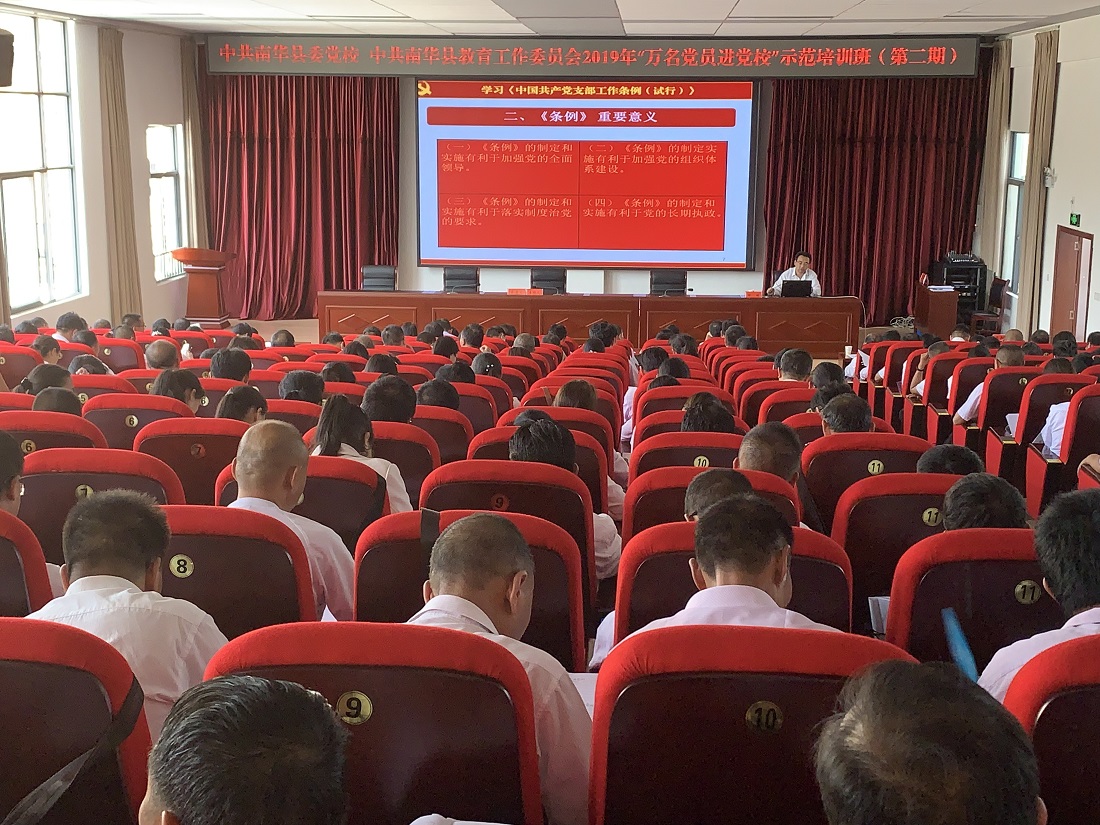 南华县教育工委根据县委“基层党建创新提质年”和“万名党员进党校”培训工作的统一部署要求,2019年采取乡镇中小学校党员教师7月份参加乡镇党校培训、城坝区学校党员教师于8月12日至17日分两期参加县教育工委在党校办班的方式,对教育体育系统800余名党员教师进行集中培训。