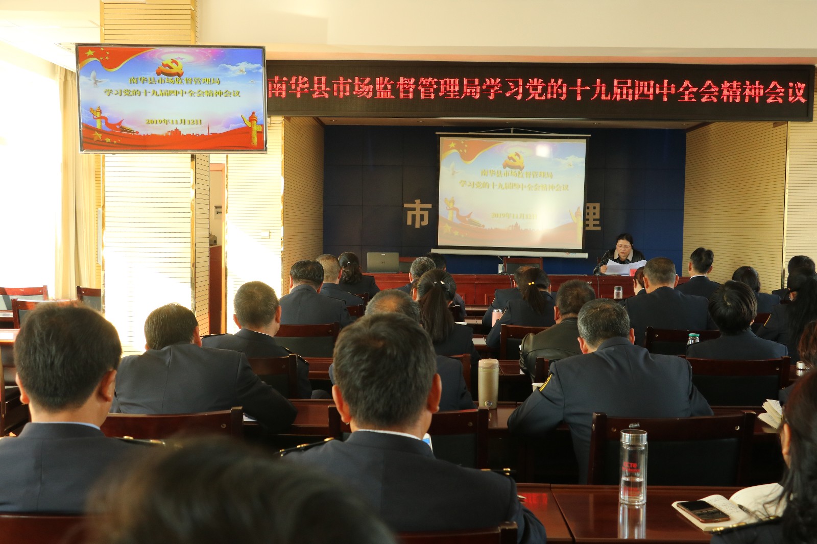 为认真贯彻落实党的十九届四中全会精神,切实增强政治自觉、思想自觉和行动自觉,11月12日上午,南华县市场监督管理局党委召开党的十九届四中全会精神学习会。局机关,龙川、雨露、沙桥、五街机关所全体干部职工,退休干部代表共64人参加会议。局党委书记、局长阿敏主持会议并原文传达和领学了《中国共产党第十九届中央委员会第四次全体会议公报》。