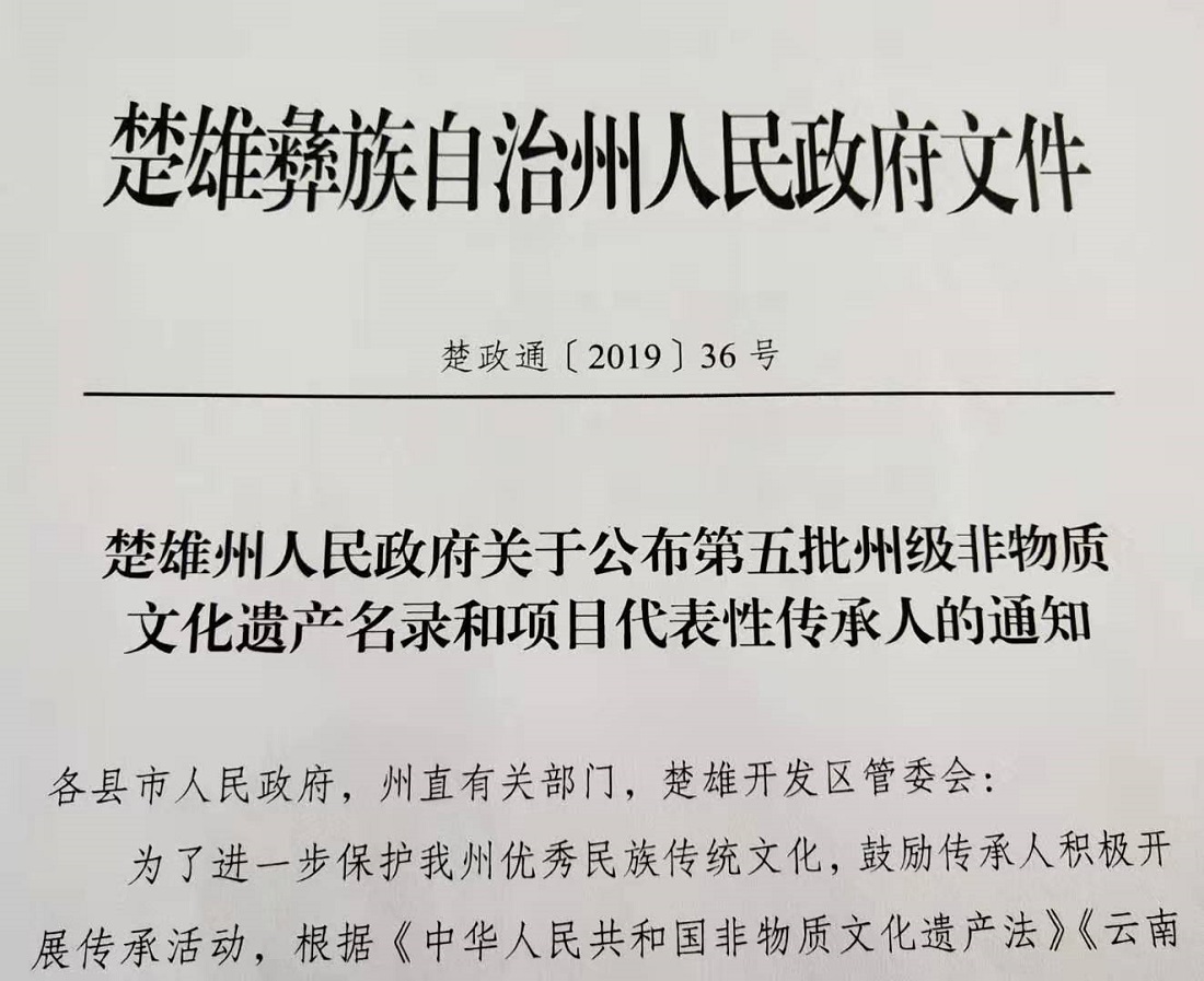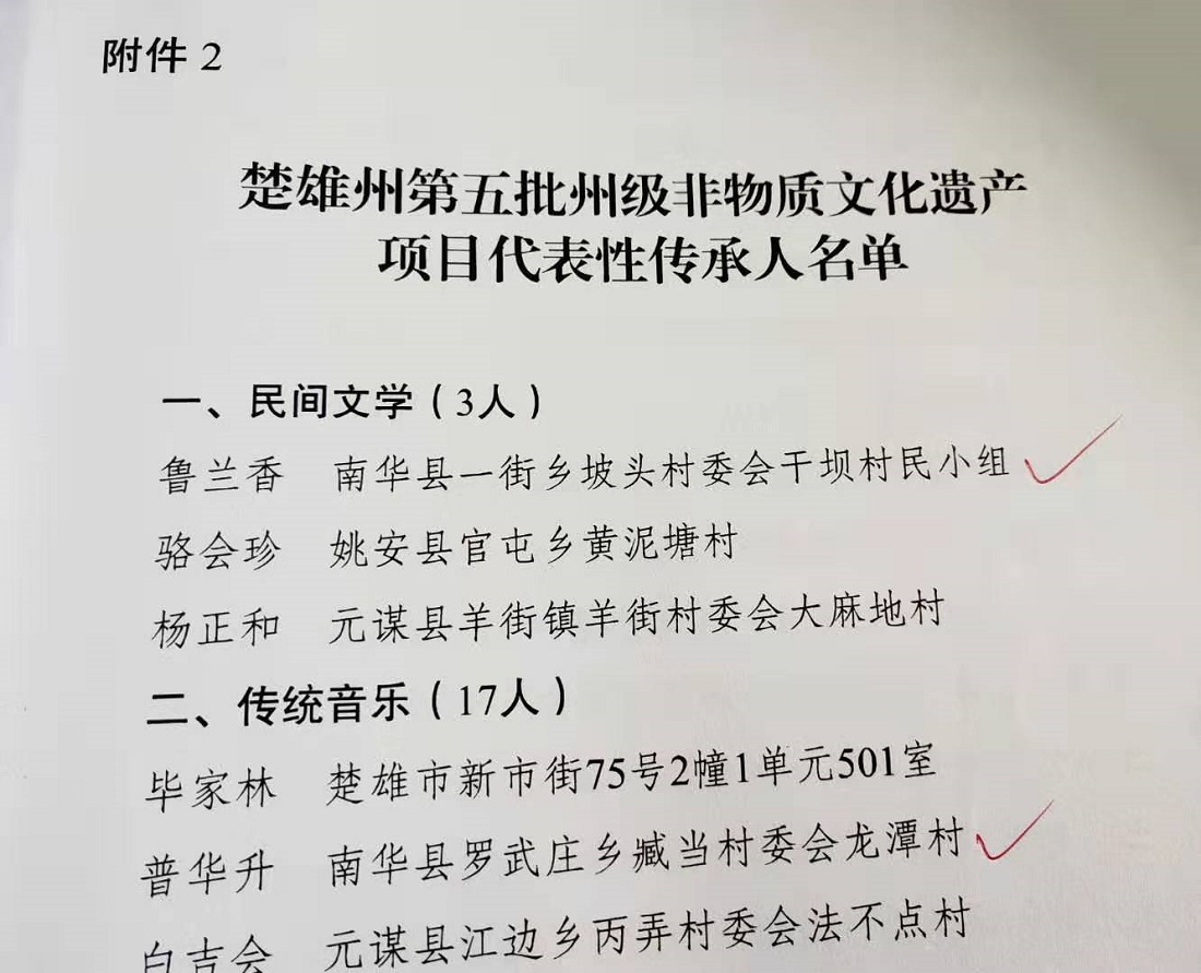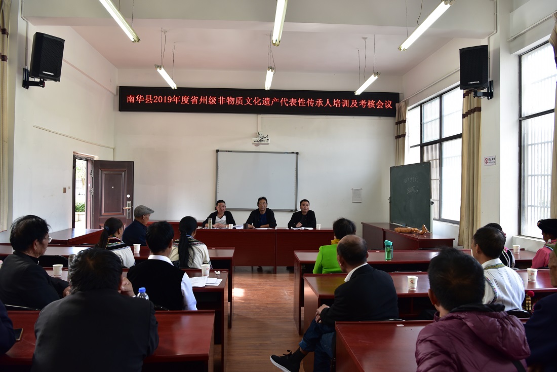 2019年11月9日,云南省文化和旅游厅发文(云文旅发〔2019〕27号)公布,南华县成功申报第六批省级非物质文化遗产代表性传承人5人;10月21日,州人民政府发文(楚政通〔2019〕36 号)公布,南华县成功申报州级非物质文化遗产项目4个,代表性传承人8名;5月6日,县人民政府发文(南政通〔2019〕10号)公布,南华县成功申报县级非物质文化遗产名录6项,县级项目代表性传承人16名。截止2019年11月底,南华县共有非物质文化遗产保护项目45项,传承人116人。其中,省级项目10项,省级传承人10名,州级项目12项,州级传承人21人;县级保护项目23项,县级传承人85名。