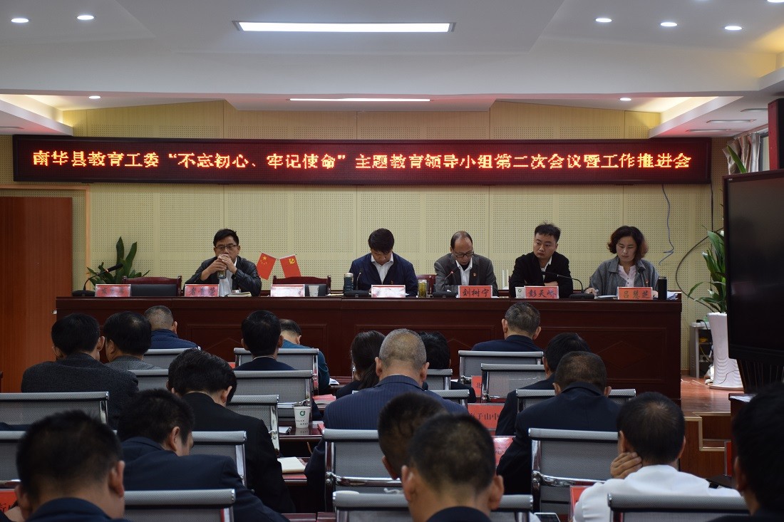 2019年11月1日上午,南华县教育工委召开“不忘初心、牢记使命”主题教育领导小组第二次会议暨工作推进会议。县委第九巡回指导组领导,县教育工委、县教育体育局党政班子成员,局机关党员干部职工,各党总支(支部)书记、校(园)长共80余人参加会议。