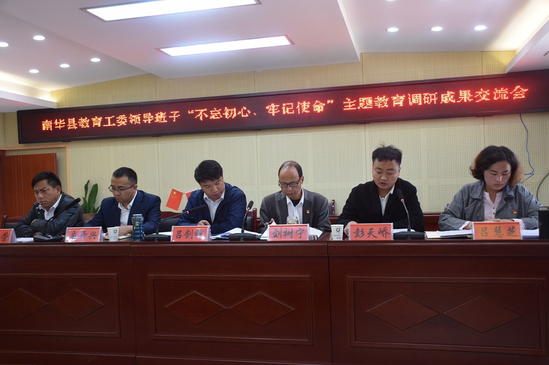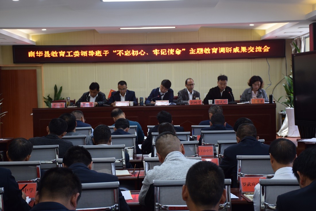 2019年11月1日上午,南华县教育工委召开领导班子“不忘初心、牢记使命”主题教育调研成果交流会,县委第九巡回指导组领导,县教育工委、县教育体育局党政班子成员,局机关党员干部职工,各党总支(支部)书记、校(园)长共计80余人参加会议。