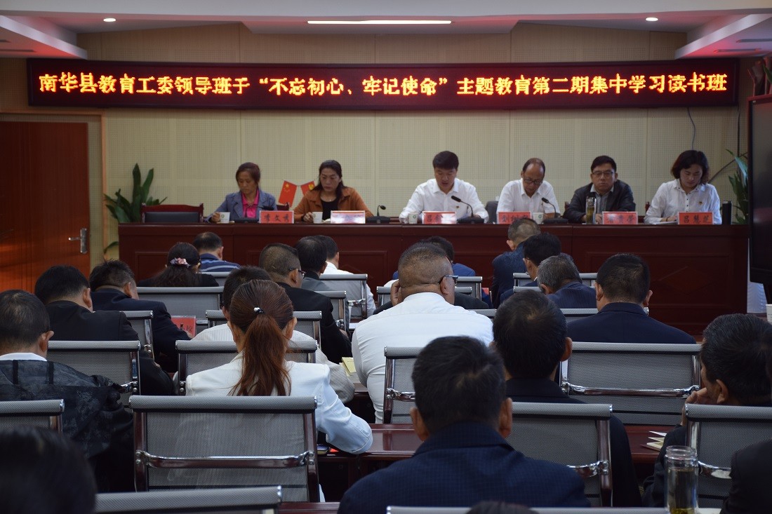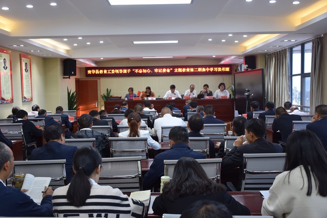 2019年10月22日至24日,南华县教育工委举办领导班子“不忘初心、牢记使命”主题教育第二期集中学习读书班。会议邀请县委第九巡回指导组领导到会指导;县教育体育局党政班子成员,局机关党员干部职工;各党总支(支部)书记、校(园)长共计80余人参加培训。