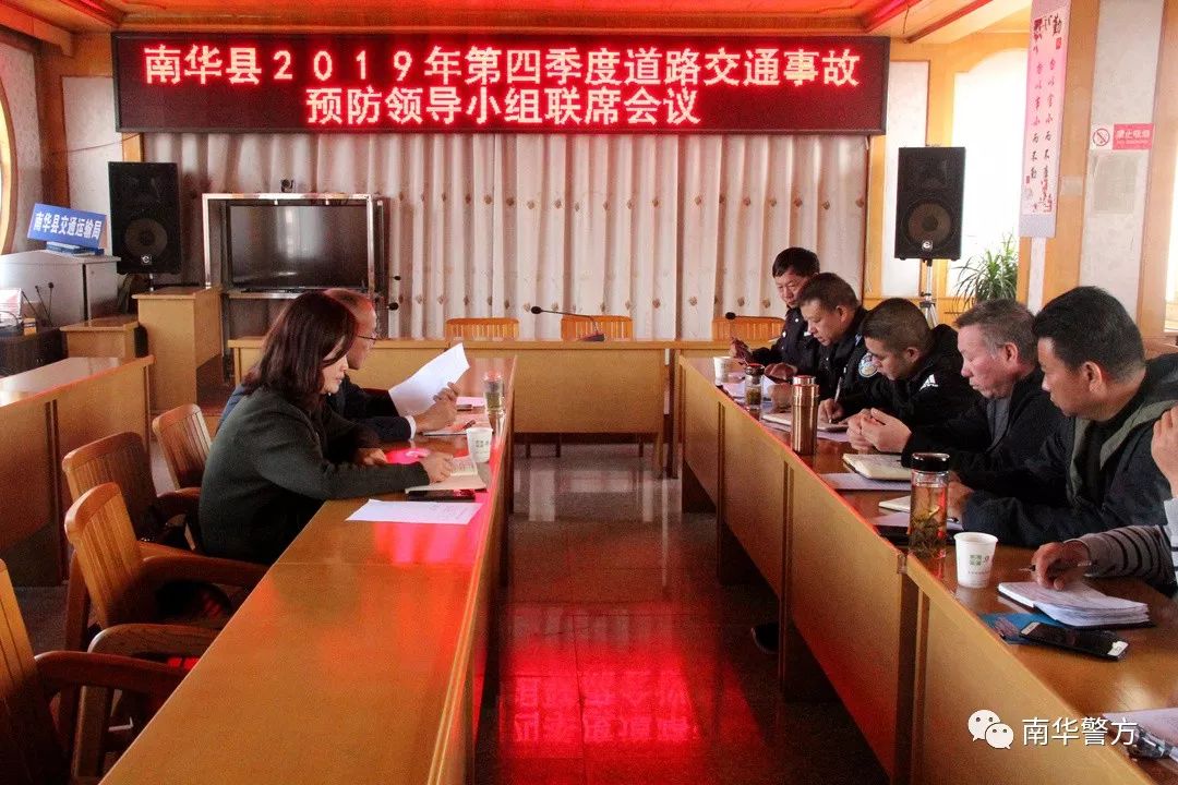 10月16日上午,南华县召开2019年第四季度道路交通事故预防领导小组联席会议,分析研判当前道路交通安全形势,研究部署下一阶段工作。县人民政府副县长纪菊丽,县人民政府副县长、县公安局党委书记、局长张惊雷出席会议并作讲话。县道路交通事故预防领导小组成员单位的主要领导,县公安局交警大队长、教导员参加了会议。