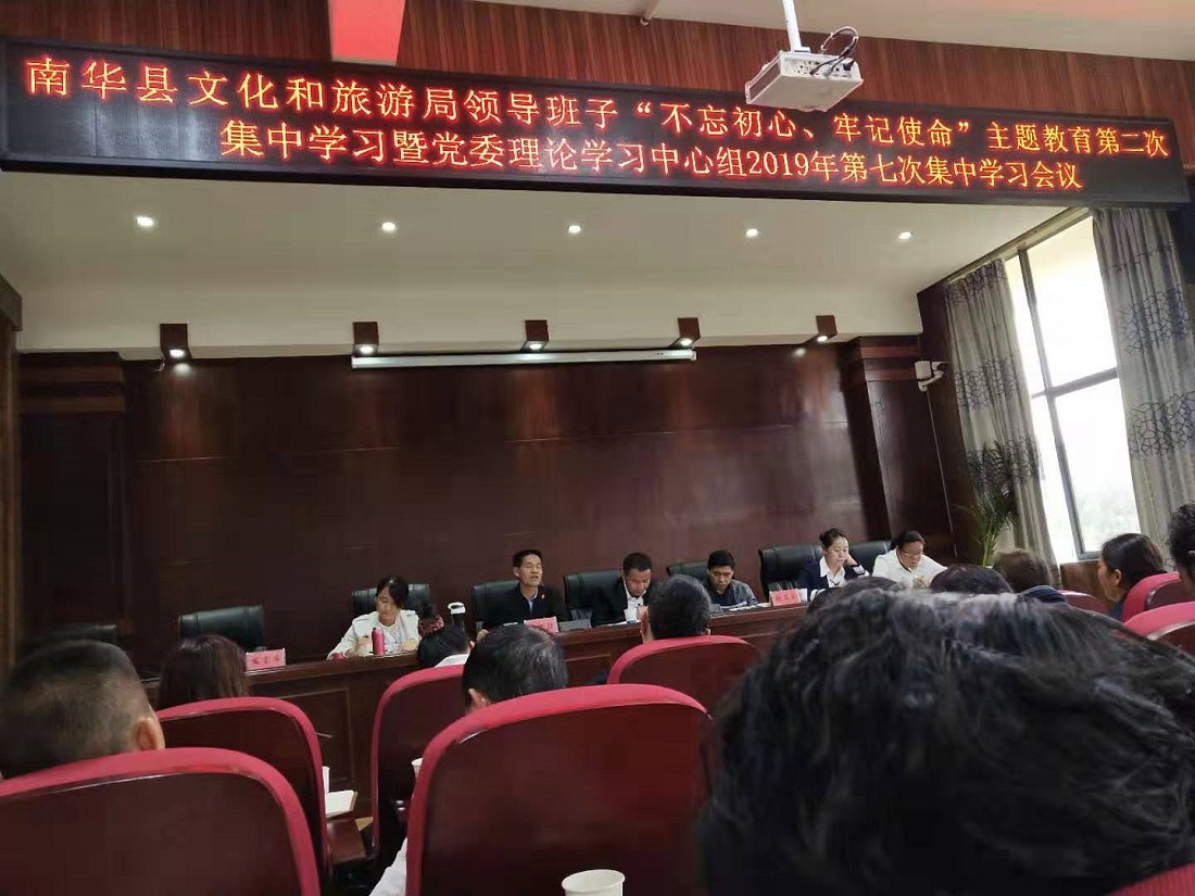10月15日,南华县文化和旅游局召开领导班子“不忘初心、牢记使命”主题教育第二次集中学习暨党委理论学习中心组2019年第七次集中学习会议,县委第十巡回指导组到会指导。