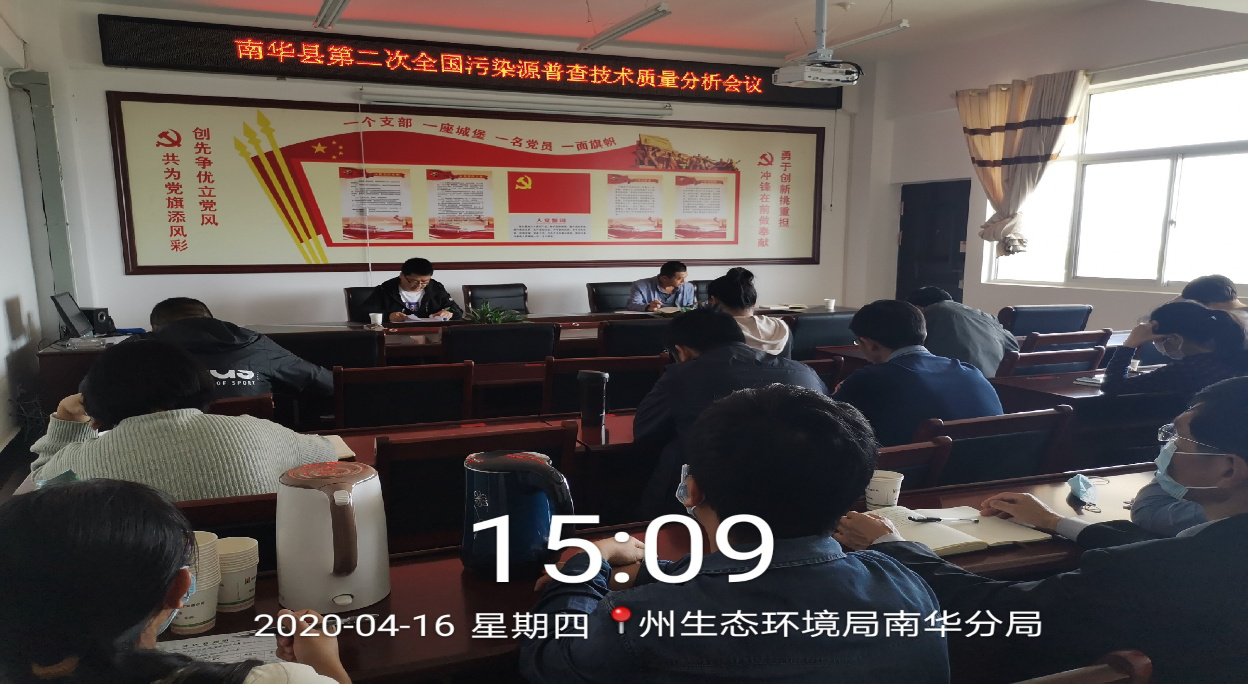 2020年4月16日下午,南华县第二次全国污染源普查技术质量分析会议在楚雄州生态环境局南华分局401会议室召开,南华县污染源普查工作领导小组成员单位分管领导,县污普办全体人员,受委托的技术服务单位(云南圣清环境科技有限公司)业务负责人共19人参加会议,会议由分局副局长祁文平主持。