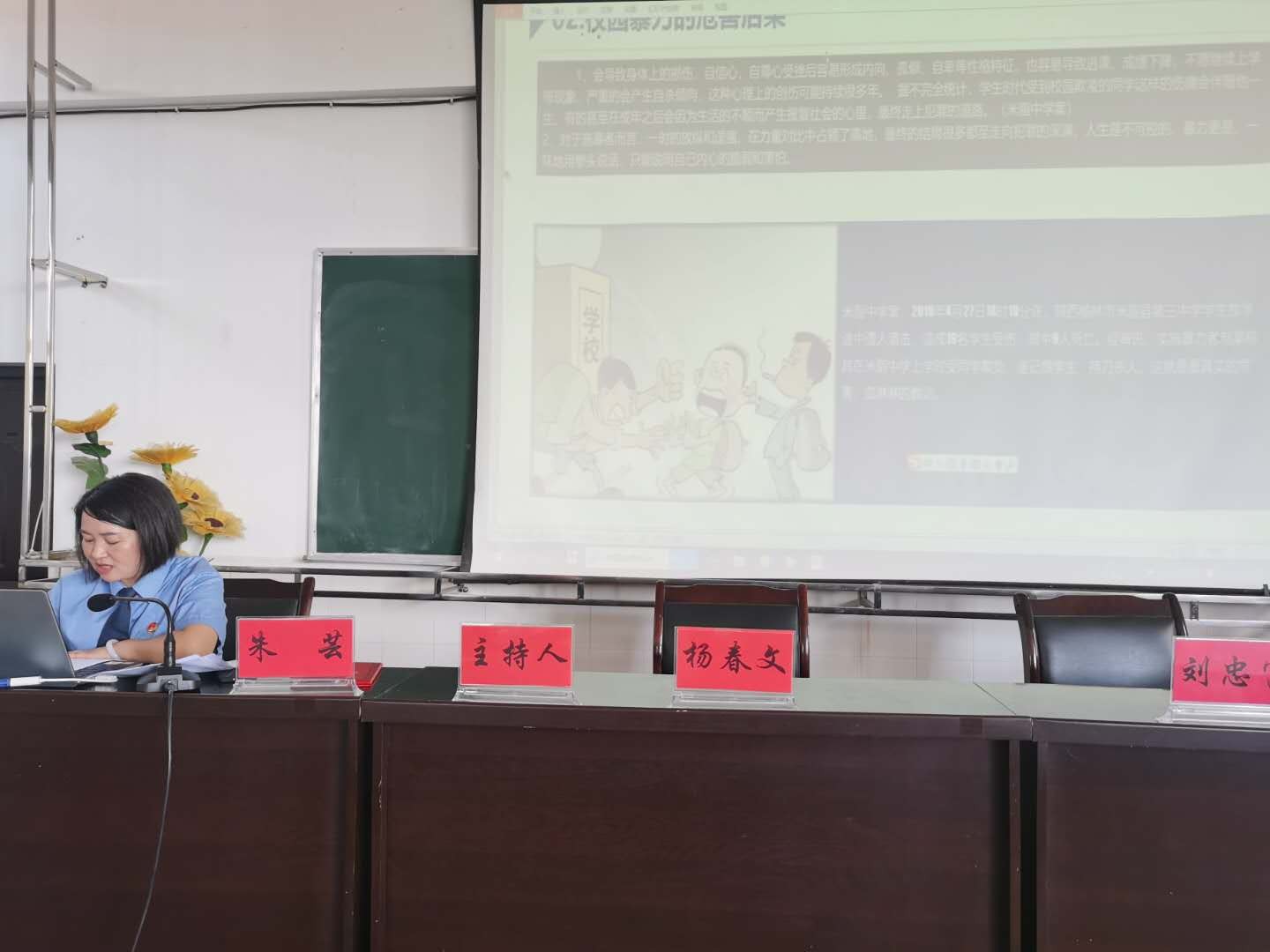 朱芸结合学生实际,应用多媒体教学设备,利用校园中实际发生的暴力案件,以案释法,以法论事,系统分析讲解了校园暴力的定义、种类、产生原因、危害、预防和控制六大要素。告诉学生在相应年龄阶段应该承担的法律责任,如何提高自身的法律意识、做好自身安全防范。告诫同学们增强法制观念,从他人的校园违法事例中吸取教训并引以为戒,用正确的方法和途径解决发生的矛盾和问题。