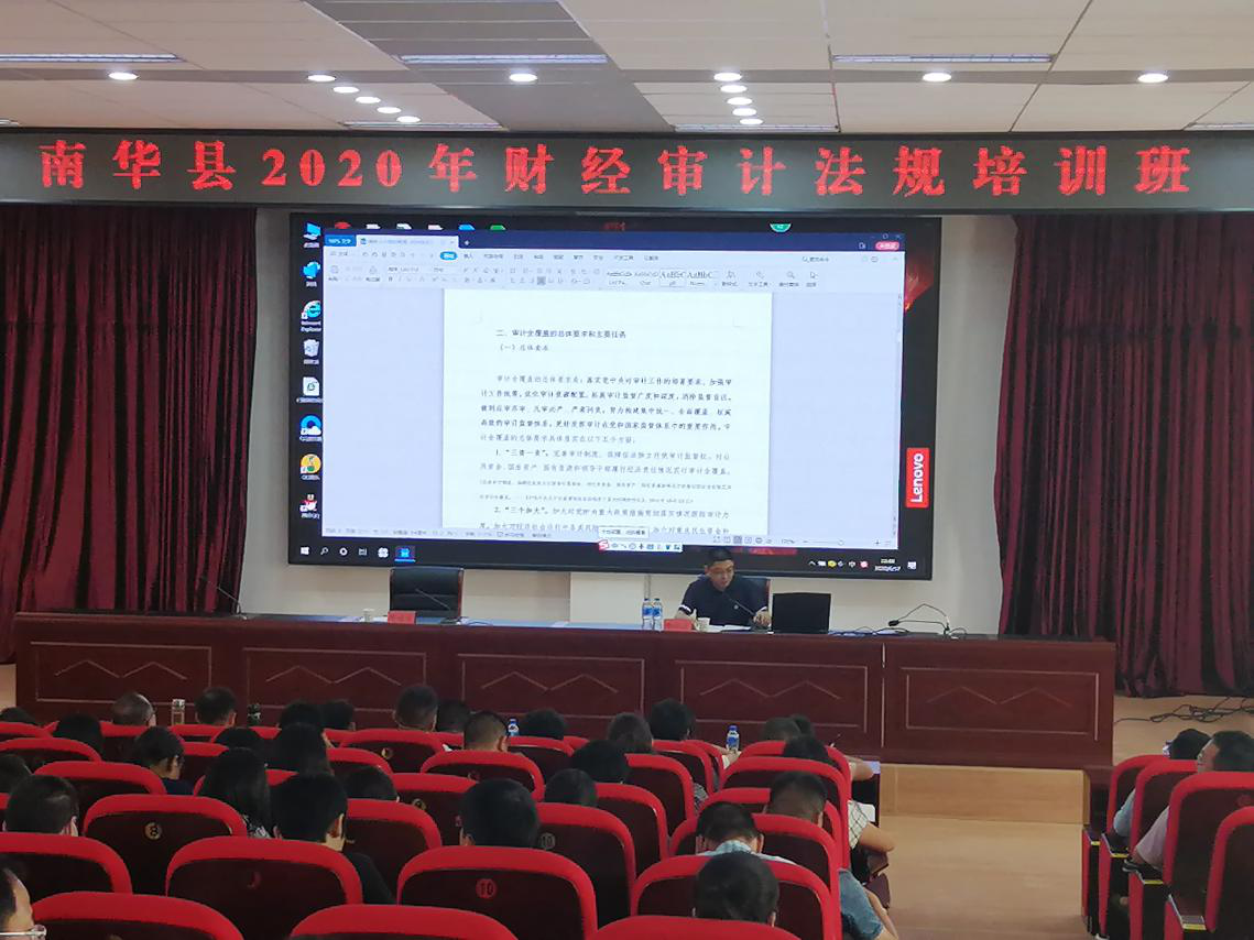 6月17日上午,在由县级单位行政负责人、财务人员和10乡镇乡镇长、财政所长等200多人参加的南华县财经审计法规培训班上,州审计局李秋洪副局长开展了《深入推进审计全覆盖,依法全面履行监督职责》的专题辅导培训。