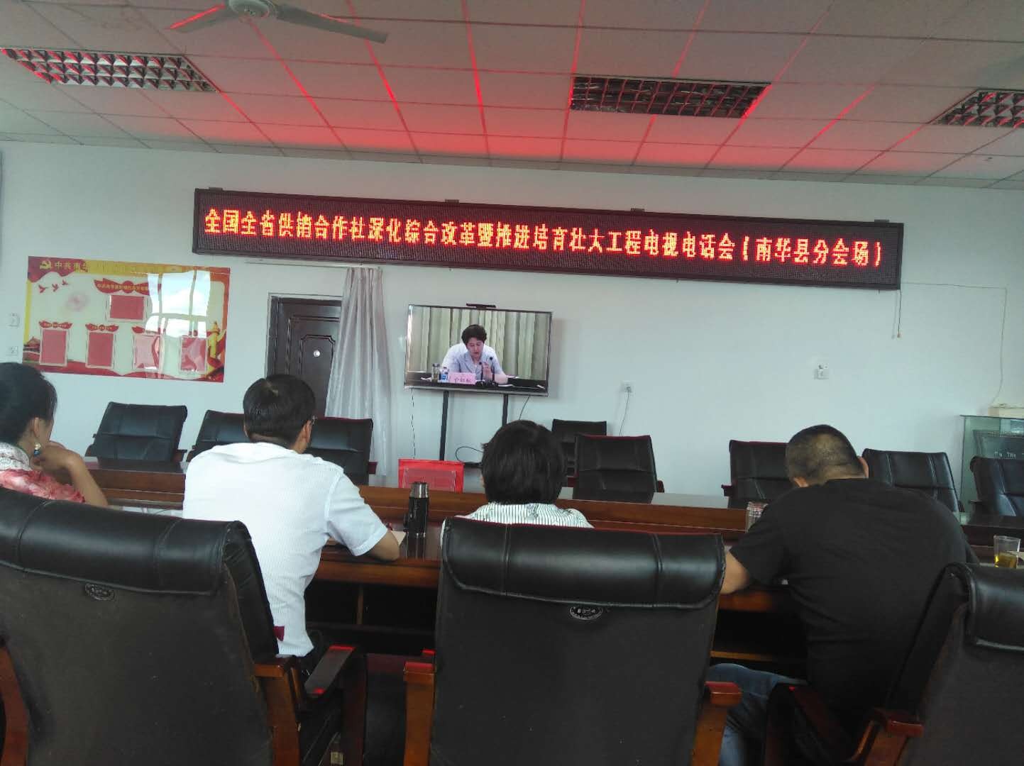 6月9日下午,县供销社组织全体干部职工在南华分会场参加全国全省供销合作社深化综合改革暨推进培育壮大工程电视电话会议。