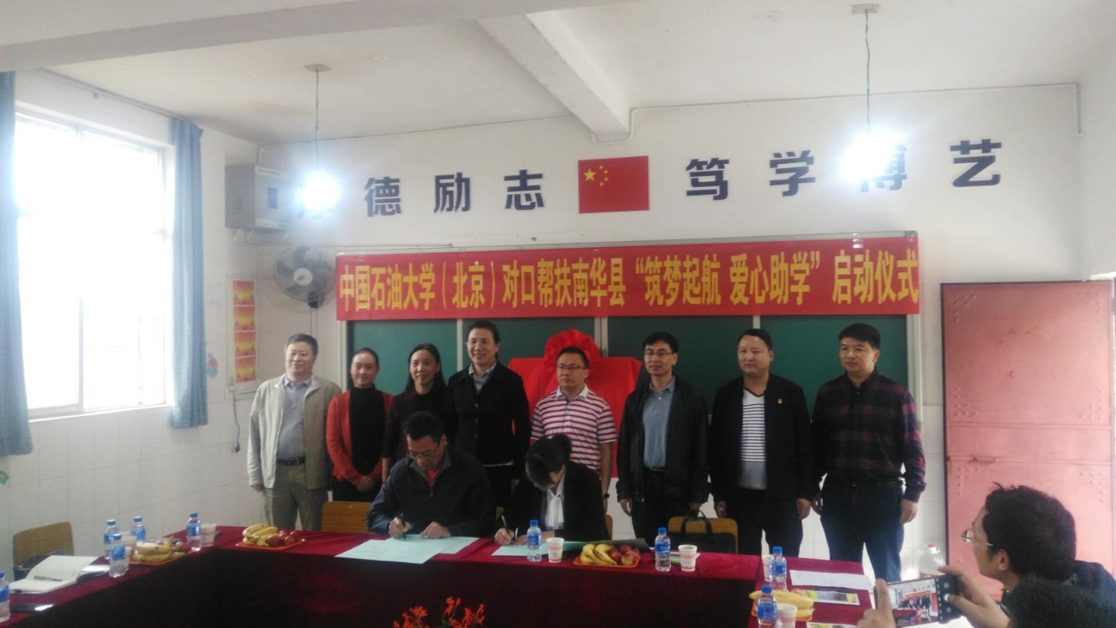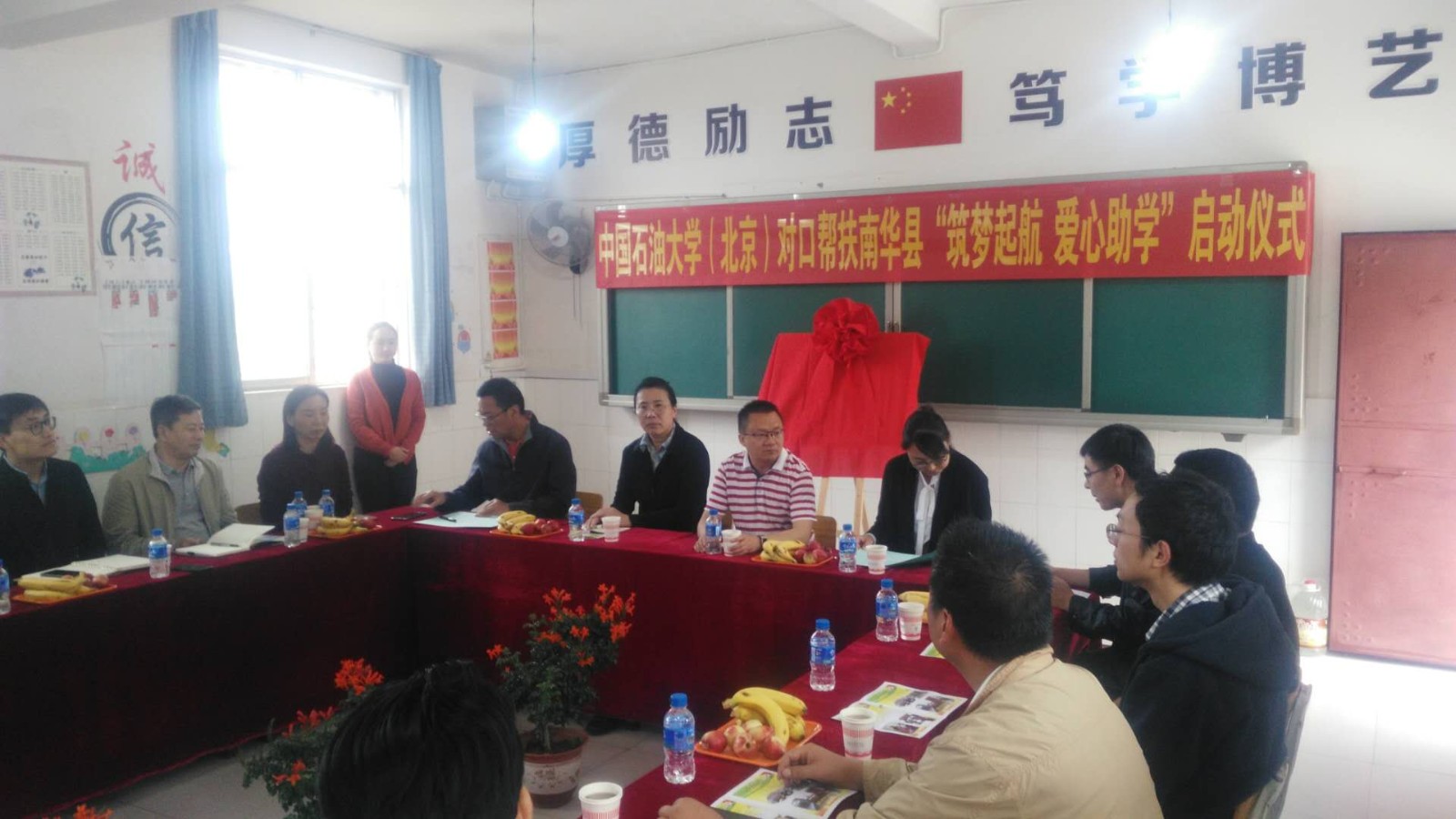 5月28日下午,中国石油大学(北京)对口帮扶南华县“筑梦起航 爱心助学”仪式在南华县龙川中心学校河硐小学启动。中国石油大学副校长吴小林、中国石油大学党委组织部部长梁喜书、中共南华县委副书记鲁泽强、县委常委、县委组织部长魏华、县人民政府副县长朱义清等领导以及县教体局、龙川镇等部门主要领导参加启动仪式。