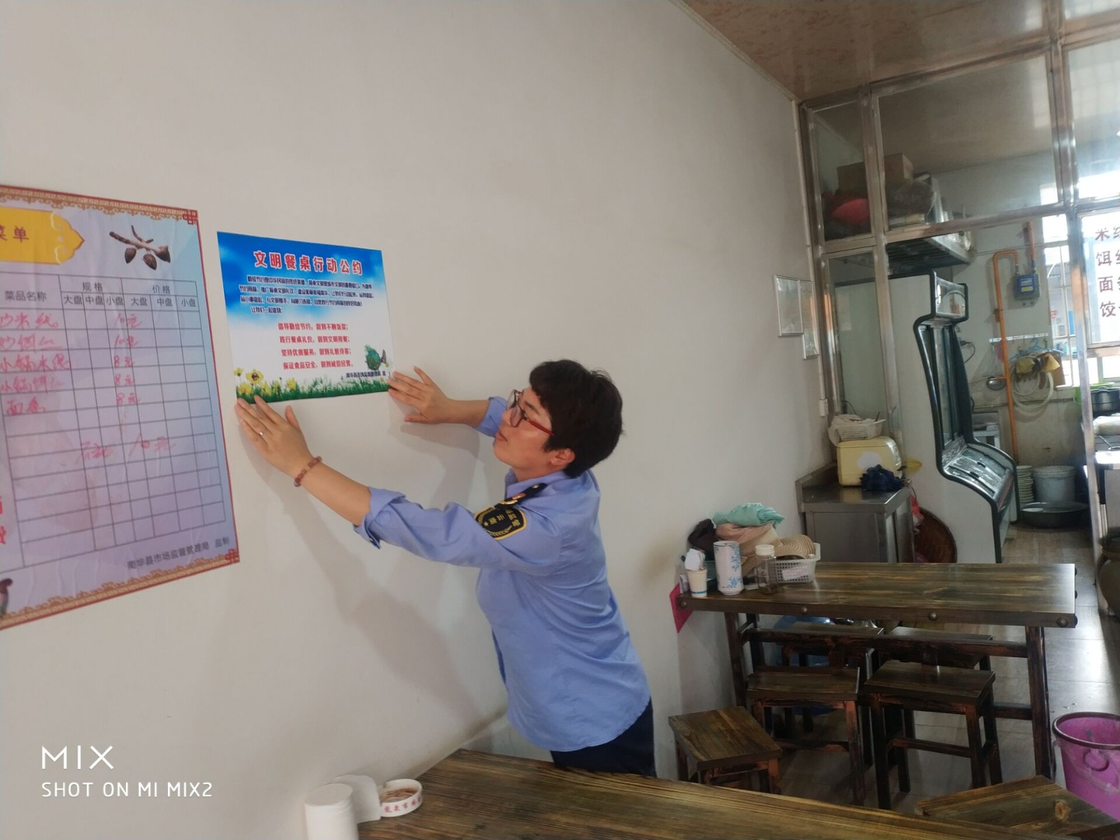 为倡导俭以养德、健康文明、积极向上的良好社会风气,助力文明城市创建工作,近日,南华县市场监督管理局协同县文明办等相关部门,对城区及周边餐饮行业广泛宣传文明餐桌知识和社会主义核心价值观,挨家挨户向餐饮店发放“文明餐桌”宣传材料,现场指导餐饮店张贴文明餐桌宣传海报和“光盘行动”宣传桌牌,督促指导各餐饮经营户开展文明用餐、节俭养德宣传。