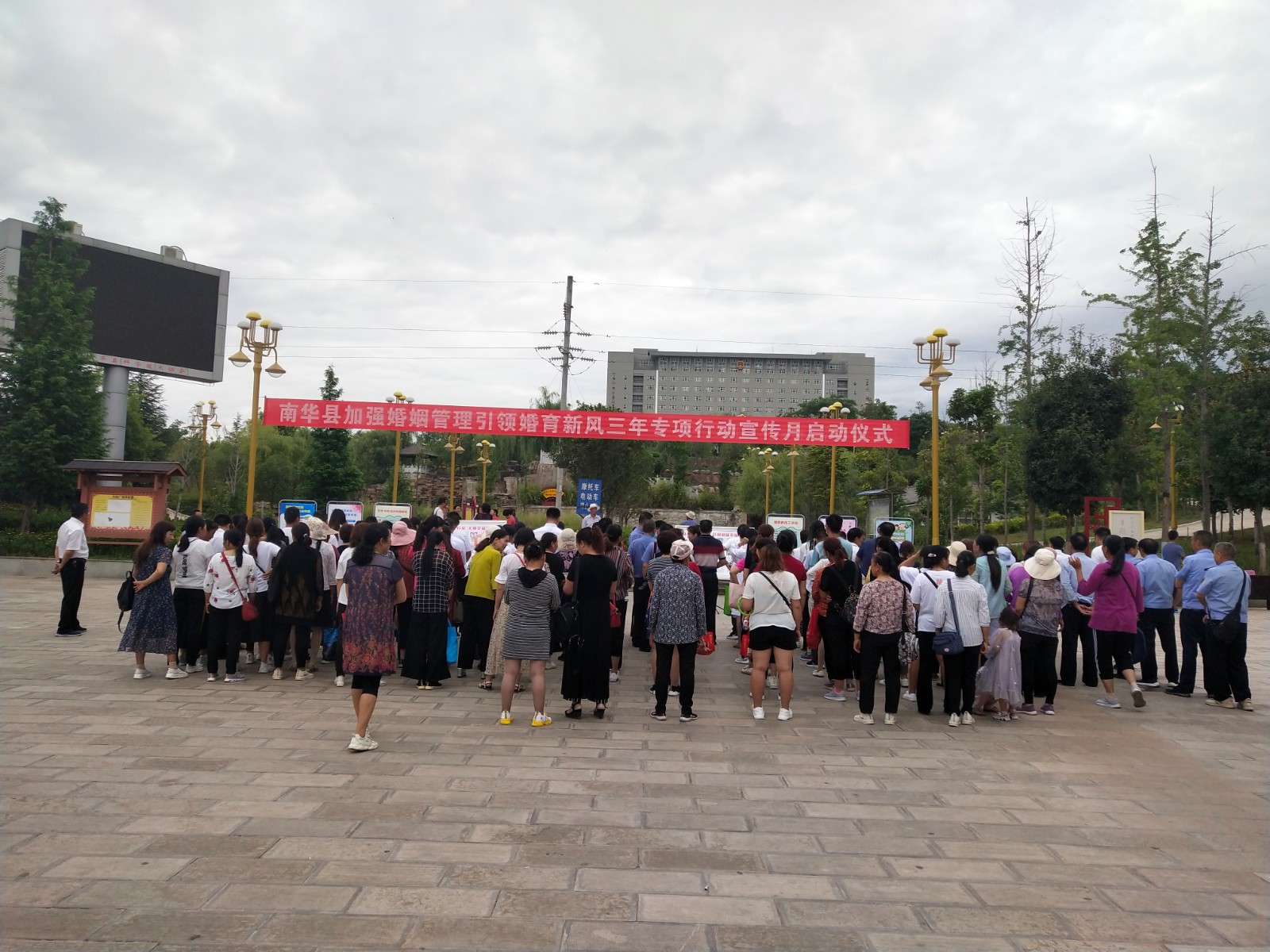 7月1日上午南华县委、县人民政府组织县委办、县政府办、县委宣传部、县公安局、县人民检察院、县人民法院、县民政局、县教育体育局、县人力资源和社会保障局、县卫生健康局、县司法局、县市场监督管理局、县扶贫办、团县委、县妇联的领导及干部职工代表,龙川镇分管领导和部分干部职工代表,部分青年志愿者代表,在县市民广场开展加强婚姻管理引领婚育新风三年专项行动宣传月启动仪式。
