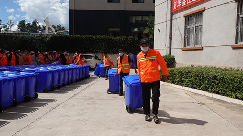 县住建局副局长、城管局局长吴军贤在分配现场强调:开展爱国卫生行动是省委、省政府贯彻落实习近平总书记考察云南重要讲话精神作出的重大决策部署,是持之以恒改善我县城乡人居环境,满足人民群众对美好生活向往的具体实践。全体人员要站在讲政治、顾大局的高度充分认识爱国卫生专项行动工作的重要意义,切实把思想和行动统一到县委、县人民政府的安排部署上来,增强责任感,凝心聚力,确保爱国卫生专项行动工作取得实实在在的成效。环卫保洁人员作为城市环境的美容师,要一如既往做好城区公共区域环境卫生保洁,为大家配发垃圾桶,是让大家保洁起来更方便,更有效率,大家要充分利用好,继续为打造干净、宜居、美丽南华作出更大贡献。