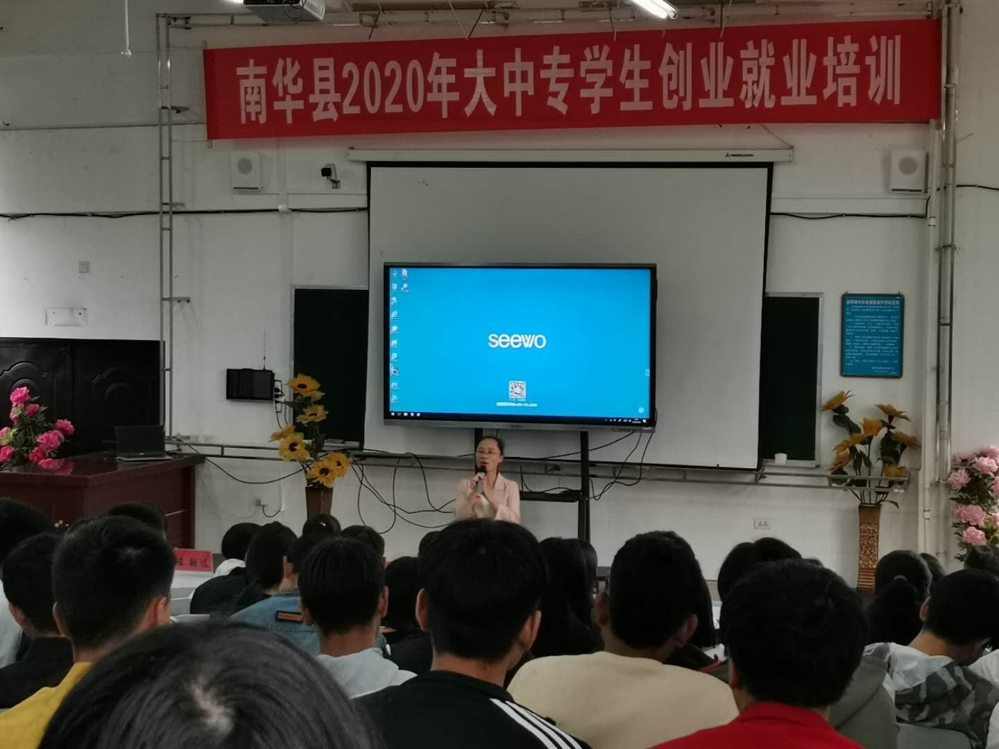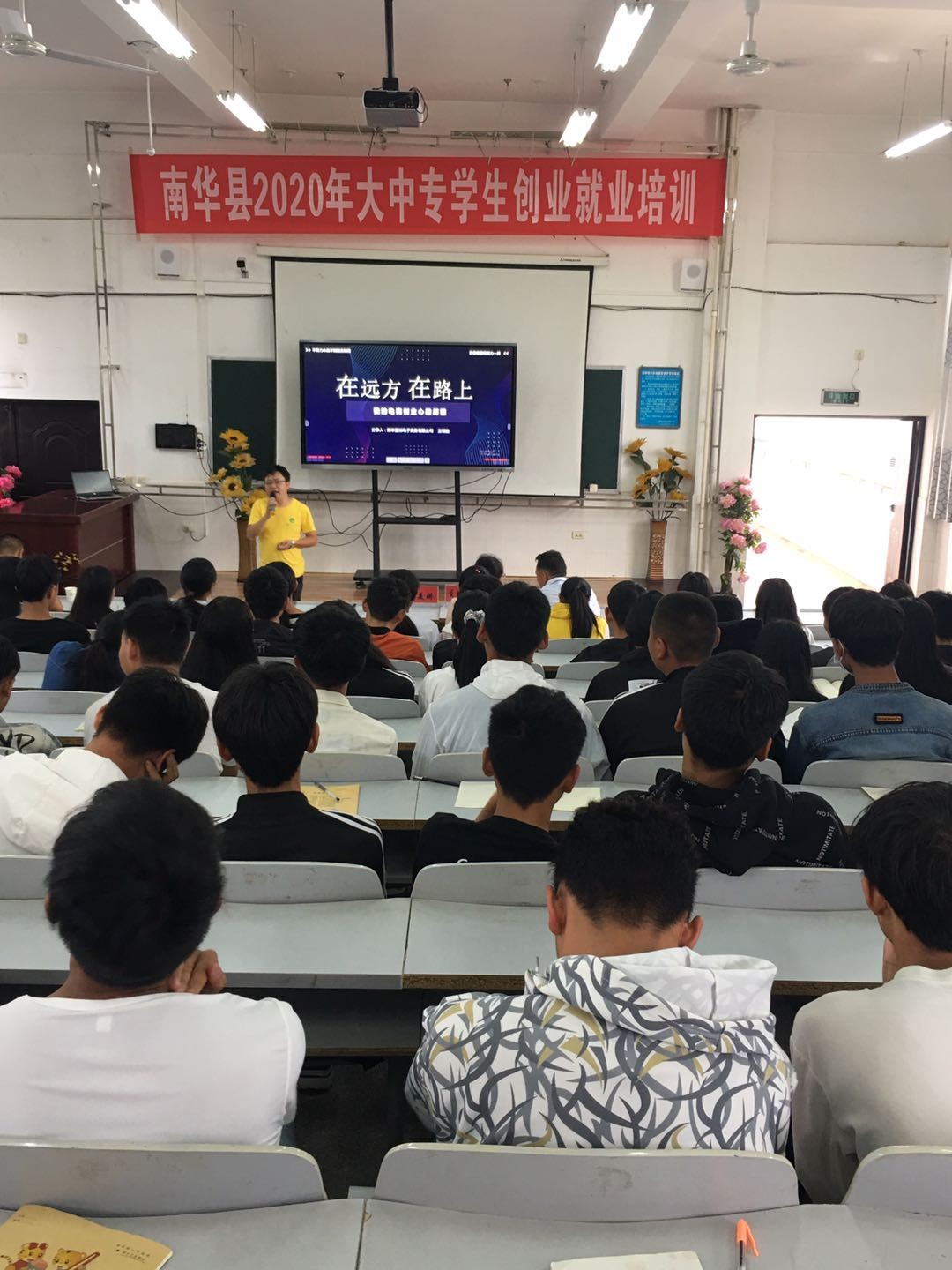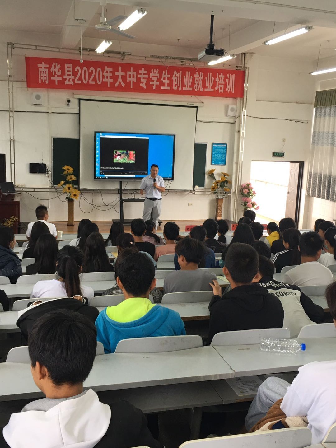 为做好我校学生创业就业服务工作,南华职中在团县委的大力支持下,于2020年9月23日上午组织高一高二学生开展“创业就业培训”,邀请南华天健农业公司总经理周自灵同志和南华蓝标电子商务公司总经理王朝选同志进行创业就业、电商创业和直播带货就业培训。