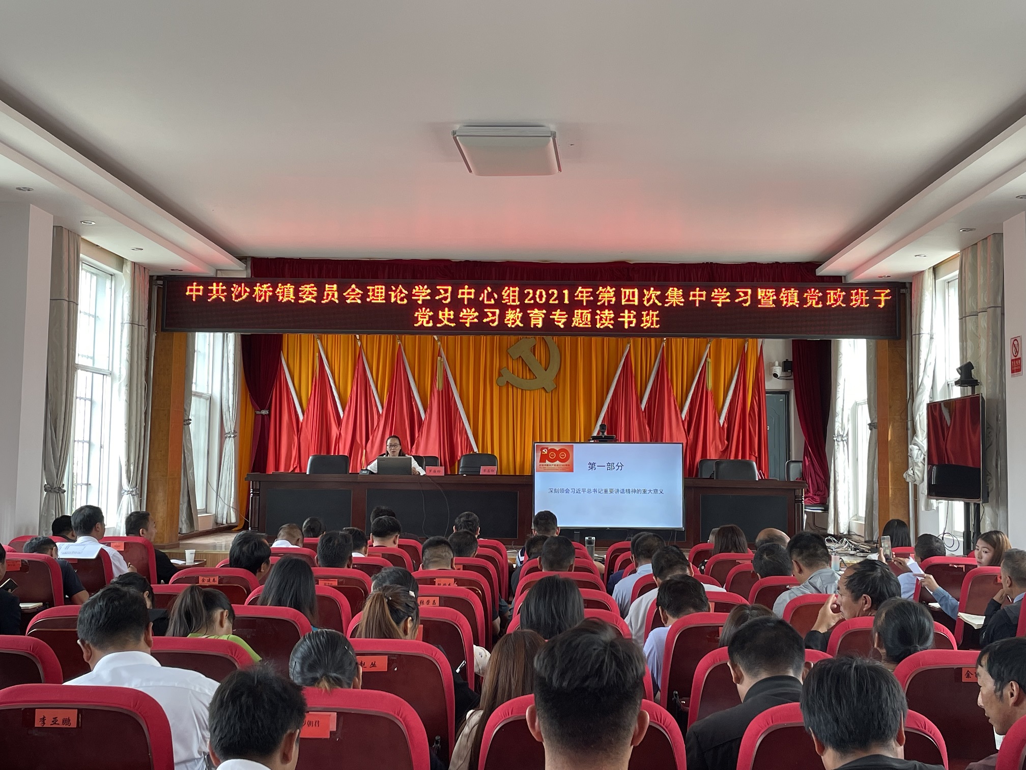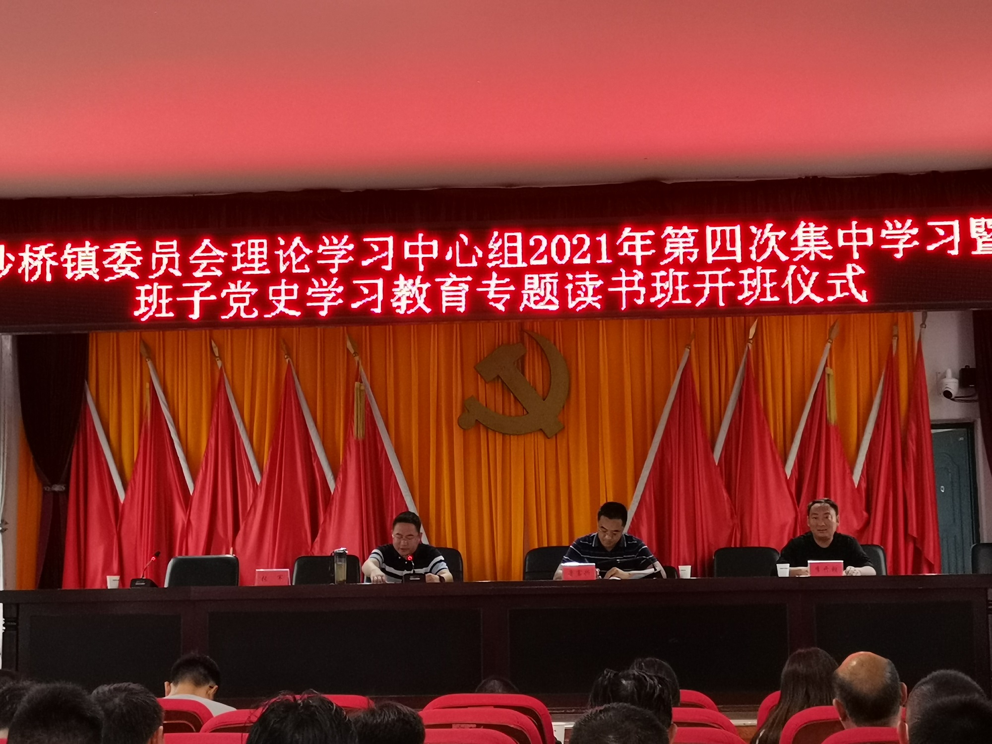 为认真贯彻落实党史学习教育的部署要求,深入学习贯彻习近平总书记关于学习党史的重要论述和习近平总书记在庆祝中国共产党成立100周年大会上的重要讲话精神,深刻感悟习近平新时代中国特色社会主义思想伟力,扎实推进党史学习教育各项工作。8月23日至24日,沙桥镇举办中共沙桥镇委员会理论学习中心组2021年第四次集中学习暨镇党政班子党史学习教育专题读书班,镇党政领导班子全体成员、县委党史学习教育巡回指导组组长、五办七中心主任、各村党总支书记、镇属各支部书记、副书记共50余人参加。读书班由沙桥镇党委副书记、镇长张军主持。