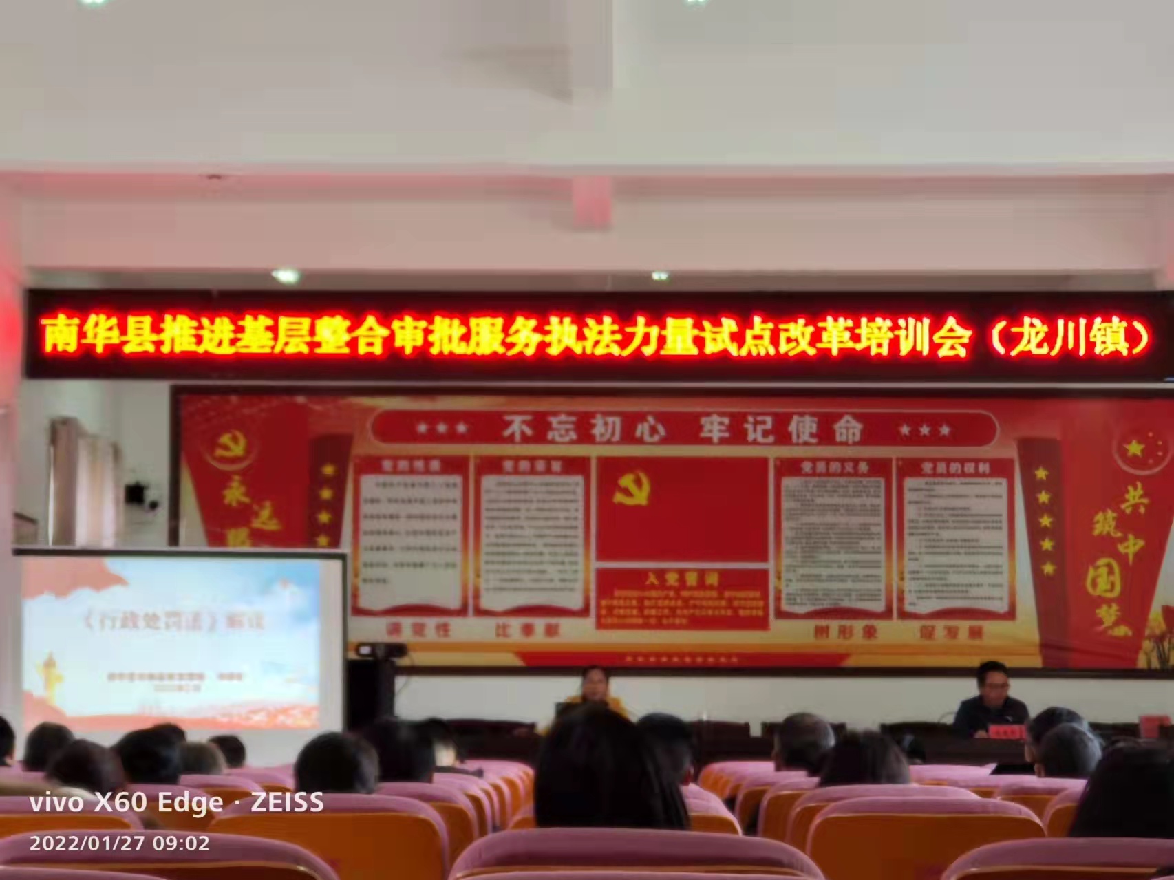 为扎实推进全镇基层整合审批服务执法力量改革,确保顺利承接赋权事项,有序开展综合执法等工作,按时间节点高标准高质量完成此次改革任务,1月26日-27日,南华县推进基层整合审批服务执法力量试点改革培训会在龙川镇召开。此次培训坚持问题导向,聚焦基层干部能力素质提升,时长共1.5天,7项专题辅导涵盖审批服务事项、执法法律依据、执法实务及相关难点重点问题等内容。全镇120余名干部职工参加培训,龙川镇综合行政执法局局长余建华主持会议,南华县司法局副局长李晓丽出席开班仪式并作动员讲话。