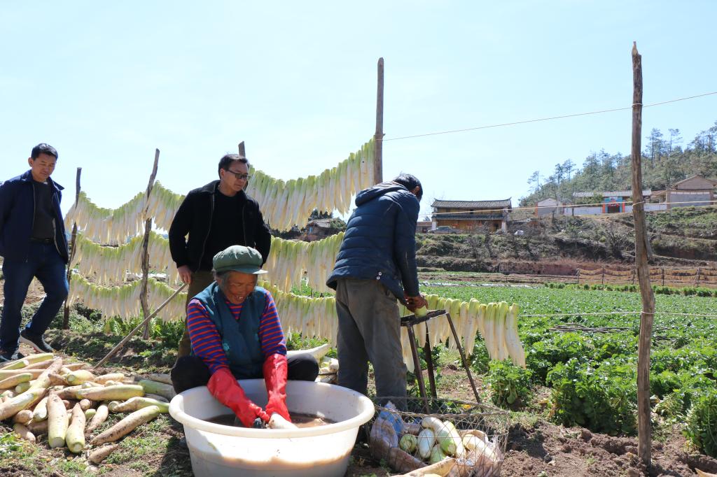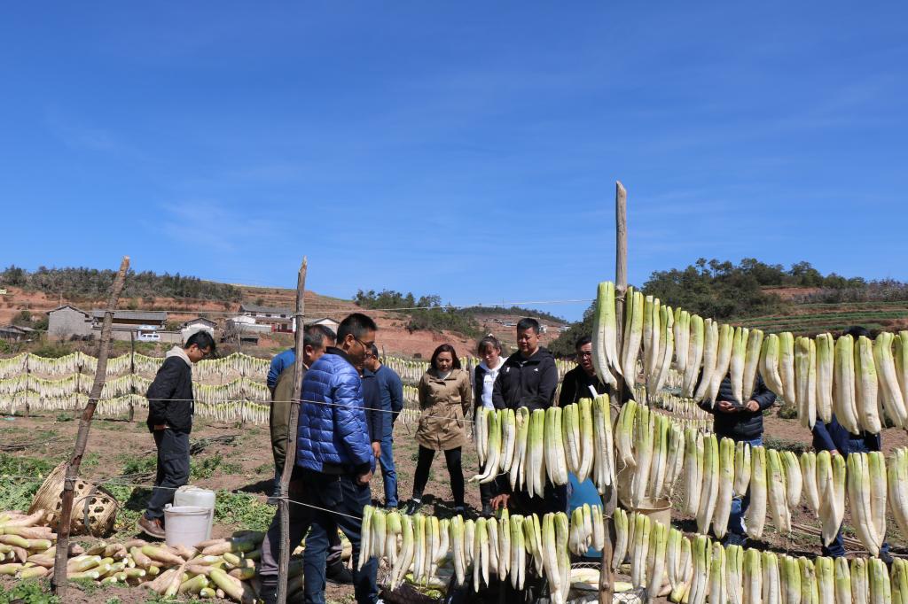 考察组走进田间地头,与咪黑们村普早塘村民进行交流,就萝卜产业发展进行探讨,详细了解了萝卜种植、植株管理、萝卜条加工、销售等信息,亲自体验了加工萝卜条的技艺。