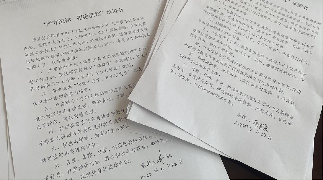最后集中签订了《“严守纪律拒绝酒驾”承诺书》以及《“严守纪律拒绝赌博”承诺书》。