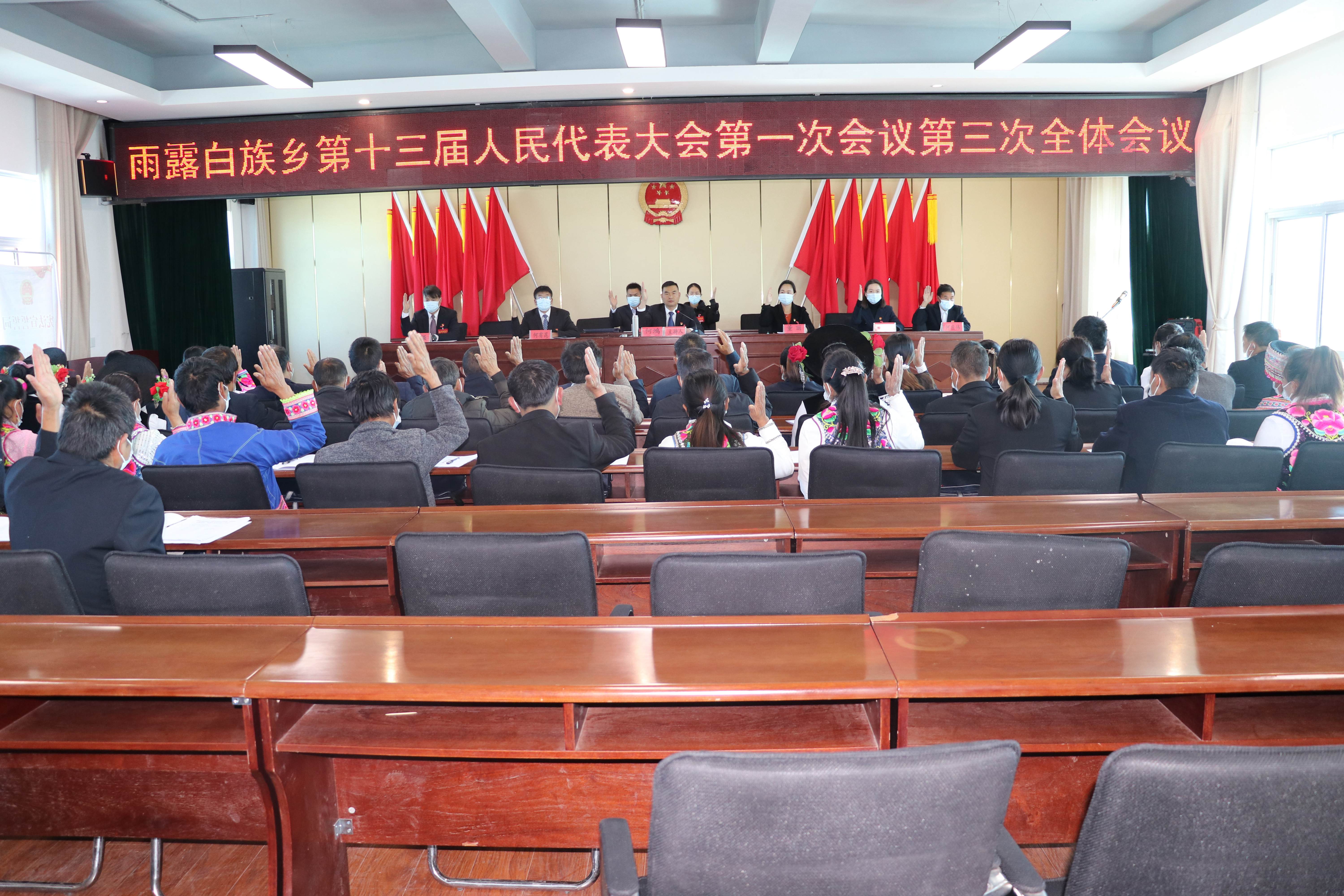 会议通过了《雨露白族乡第十三届人民代表大会第一次会议关于第十二届乡人民政府工作报告决议(草案)》。会议认为,报告高度总结了乡第十二届人民政府履职期间取得的成绩,充分肯定乡人民政府过去五年的工作,同意未来五年的工作计划及2022年工作打算。