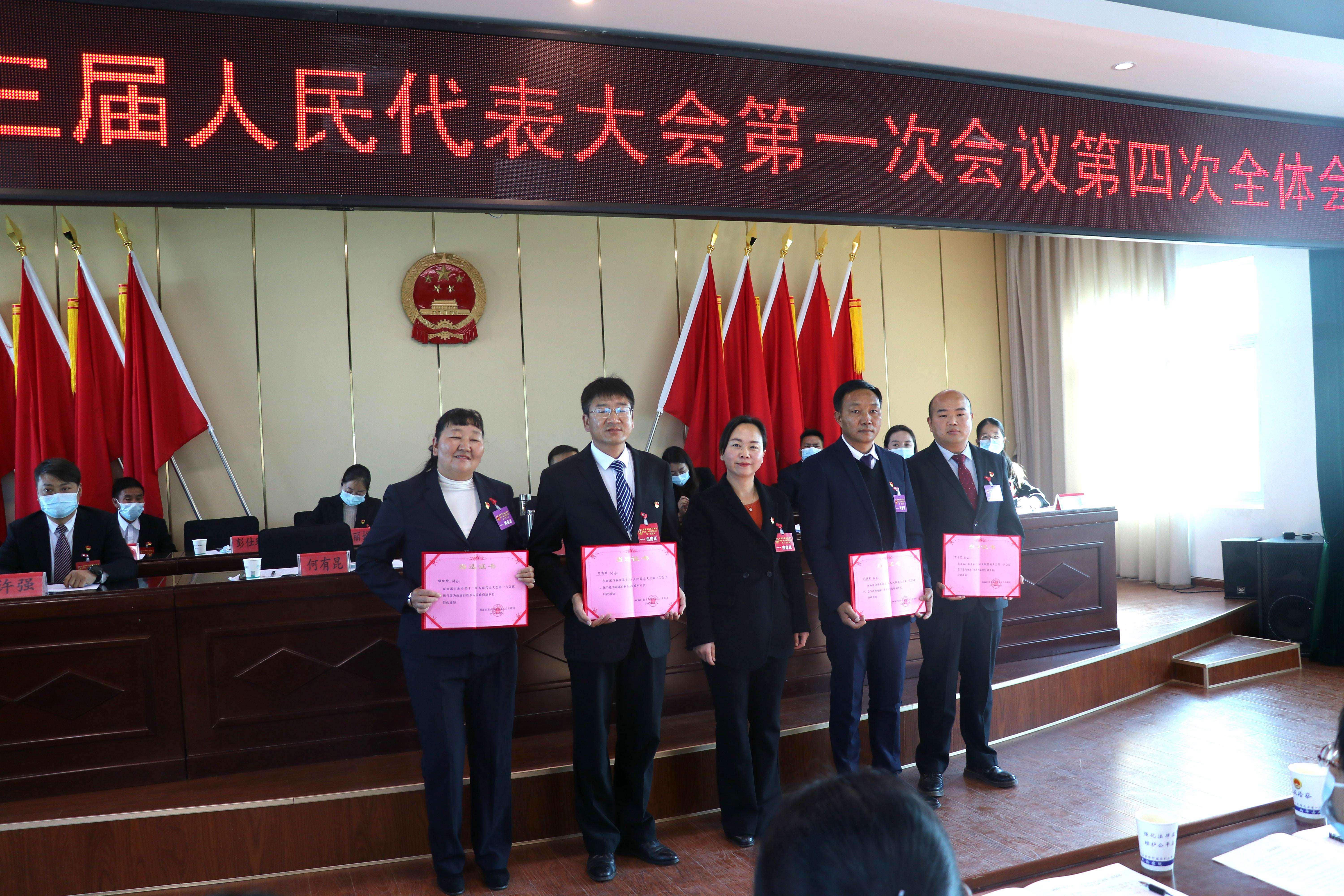 乡党委书记何鸿同志向新当选的乡人大主席团主席董丽同志颁发当选证书,董丽同志向乡人民政府乡长何有昆同志、副乡长孔兴武、丁志富、彭仕玲同志颁发当选证书。