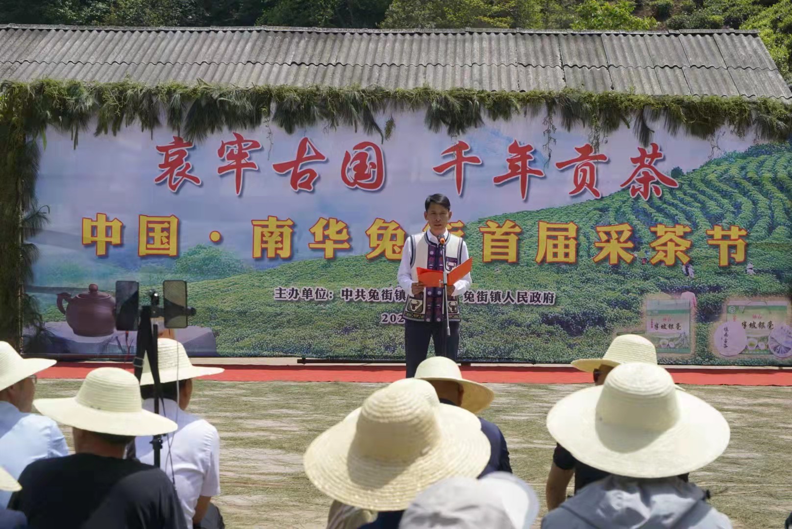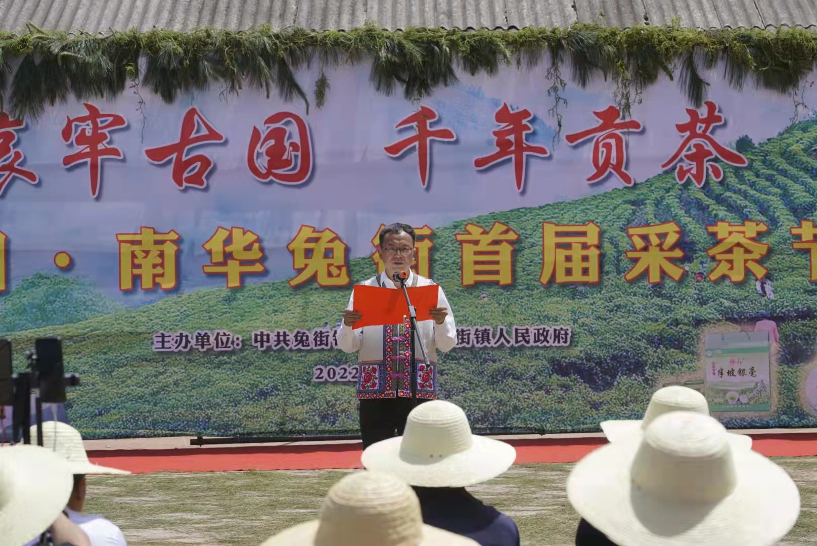 镇党委书记的致辞中,介绍了兔街镇的地理位置、民族风情、气候环境、地形地貌、茶叶产值等基本情况,以及通过举办此次采茶节,期待更好展示“哀牢古国 千年贡茶”的品牌形象,更好的彰显兔街山水田园的生态魅力,更好地发展茶产业、壮大茶经济,努力使茶叶成为群众增收的“金叶子”,助推乡村振兴的目的。