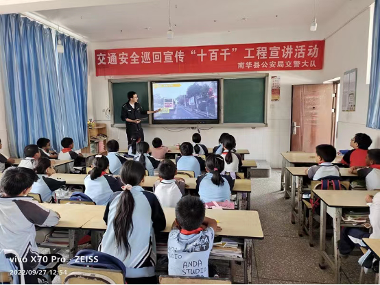 为全面强化农村道路交通安全管理,不断提升农村交通参与者的安全出行意识和交通文明素质。9月27日,南华县交警队走进一街乡,分别到密什么村委会和一街中心完小开展“十百千”工程宣讲活动。