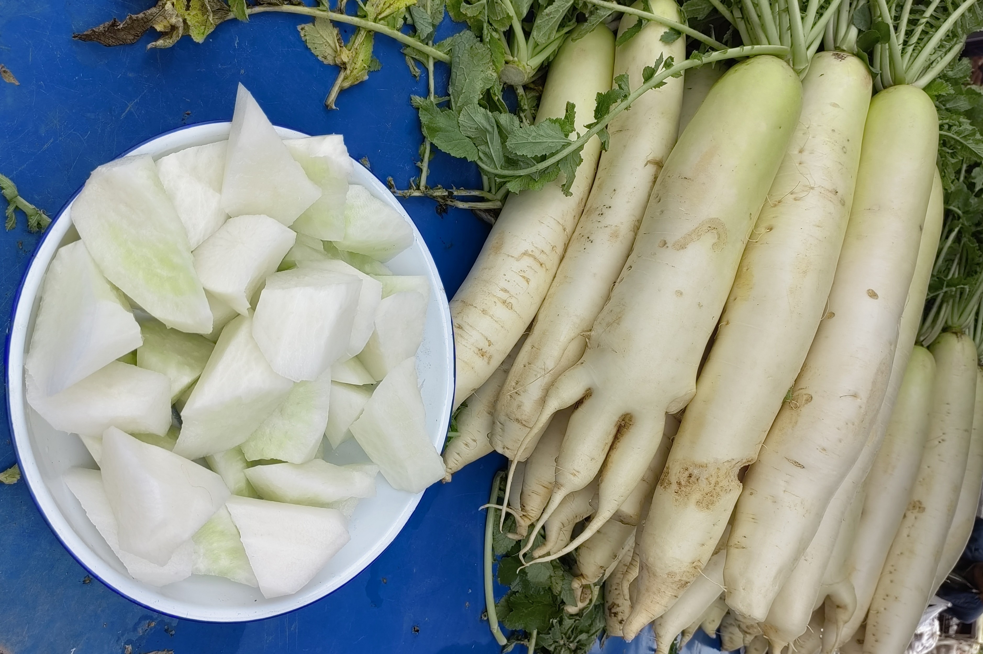 在南华县五街镇随着野生菌落潮,天气转寒,打挂山间绿油油的萝卜苗洒满山坡。再过一段时间,白嫩的萝卜便会被摆上各大摊位,切条的萝卜被挂上田中的架子风干成“白玉条”,迎接来自全国各地的客商,鼓起村民的腰包。
