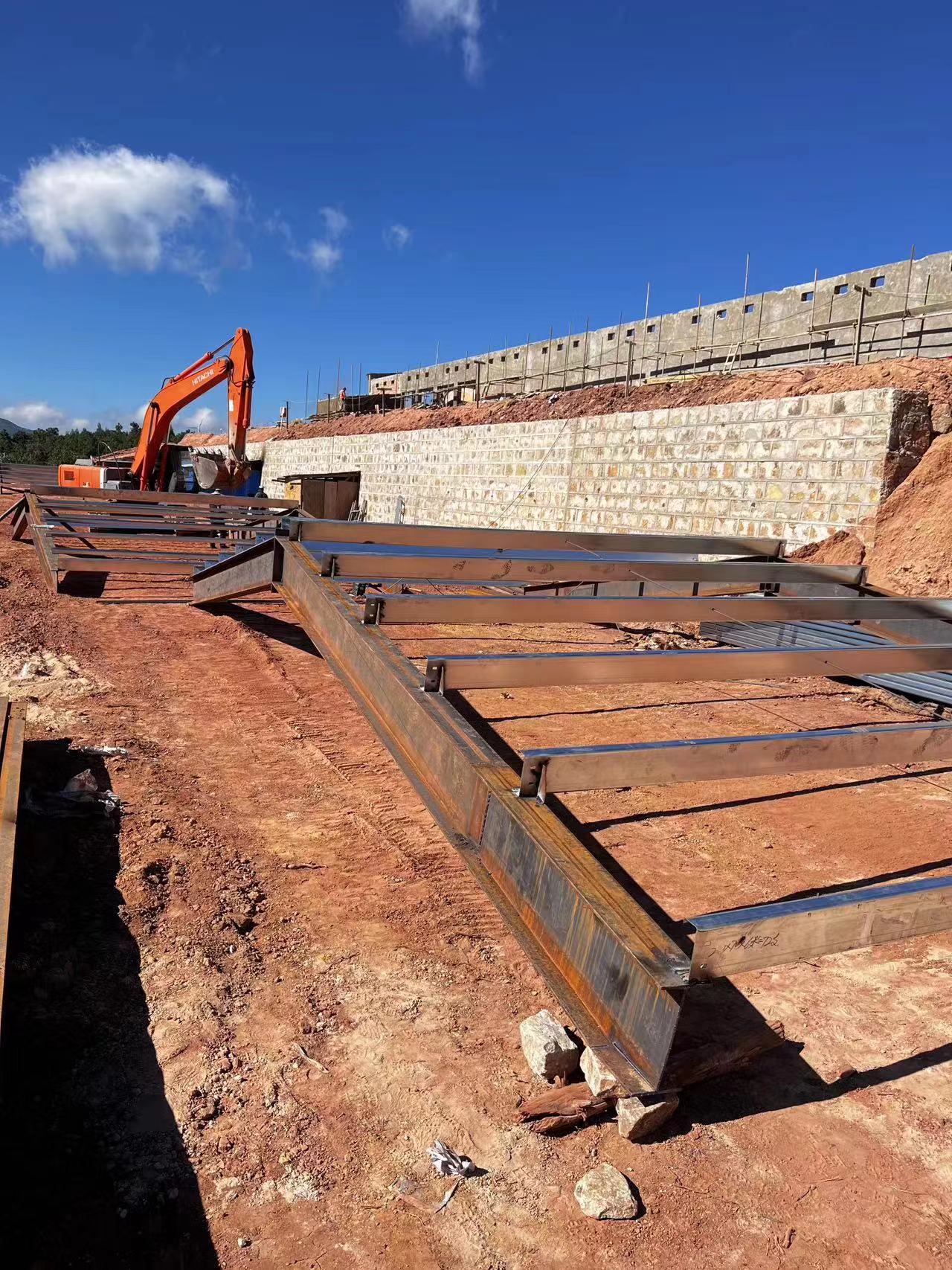 【项目建设】本周,沙桥镇石桥河村委会虾青素蛋鸡养殖场建设项目持续推进,完成土方开挖及外运27000立方米;支砌挡墙1500立方米;打机井1口;供电线路架设;养殖设备采购于10月1日通过竞争性谈判确定设备供货商为河南鑫永源养殖设备有限公司,设备在厂内已经定做完成100%。鸡舍条形基础完成100%,鸡舍墙体完成100%,鸡舍内地坪11月13日,完成100%,停车场完成60%(停车场区域为钢结构堆放及焊接制作工作面)。钢结构至11月13日完成焊接制作钢梁10架,11月14日吊装第一栋鸡舍屋顶钢梁。其余附属项目正加快进度同时推进。