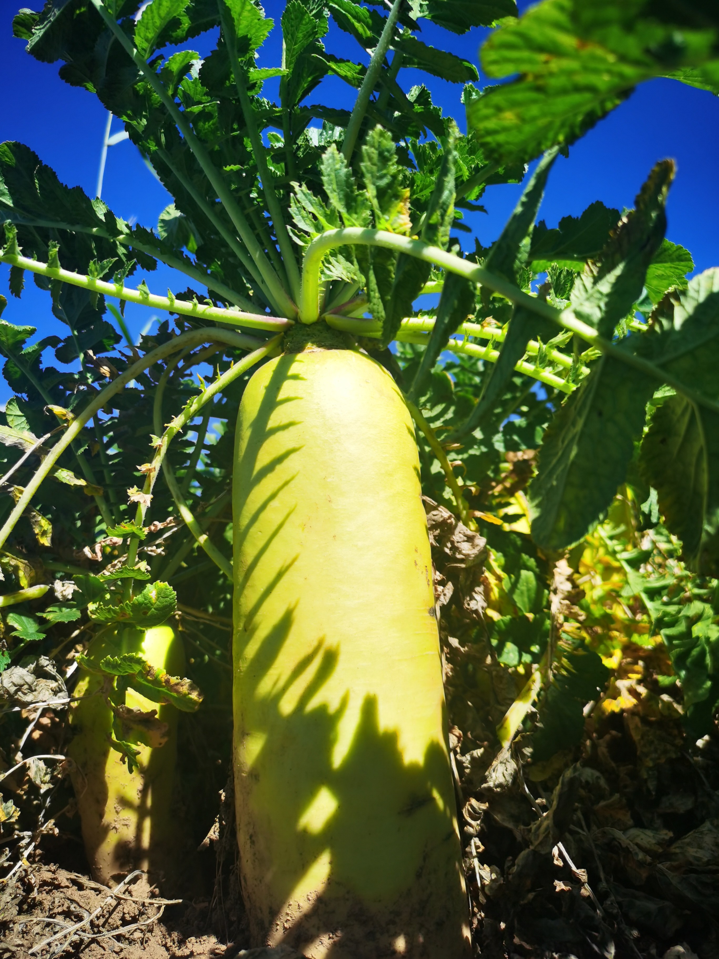 都说拔萝卜,其实现在的萝卜长得又大又深,最大的个头有一米五左右,重好几公斤,即使成年人也很难拔得出来。必须先用镰刀割去萝卜顶部不用的绿叶,等萝卜一个个从土里“探出头”,再用锄头刨松土壤,才能从土里拔出萝卜。只需一会功夫,白花花的萝卜便从地头堆到了地尾。