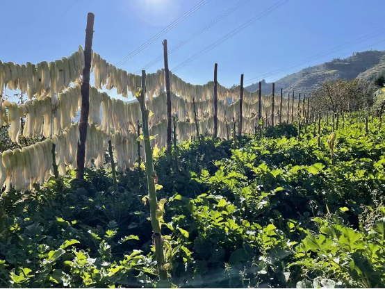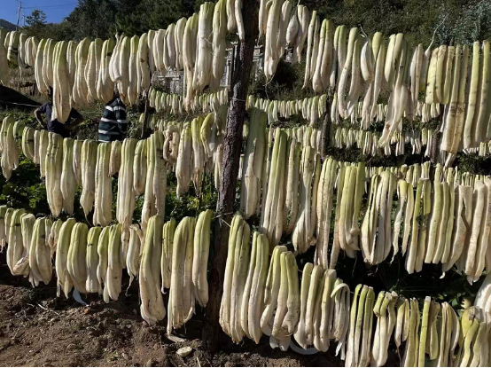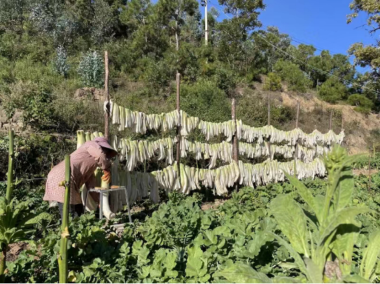 村民从地里很轻松的拔出萝卜,摘去多余的叶片,用清水进行冲洗,清洗完的萝卜整齐摆放在箩筐里,然后熟练地在切割机上一根根进行切割,整套动作干净利落,不一会,一根根萝卜条整齐地晾晒在田间的萝卜架上。